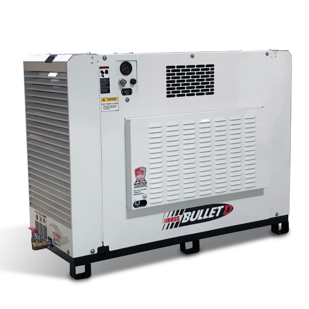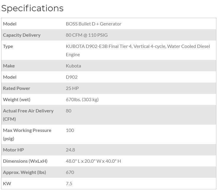 The BOSS® Bullet D is a compact, strategically designed system which integrates all major components on to a single frame, enclosed in a tough, weather-resistant canopy. The Bullet D design provides output of up to 80cfm at 100psi. Because it measures just 20” wide x 48” long x 40” high and only weighs 700lbs, the Bullet D can be set on any class truck with minimal effect on load capacity and visibility. It is narrow enough to fit into standard industrial gates and doorways, as well as service elevators for high rise or underground construction. The width of the Bullet D makes it ideal for mounting on top of a 20” wide service body compartments. On typical installations, this unit draws fuel from the vehicle source.