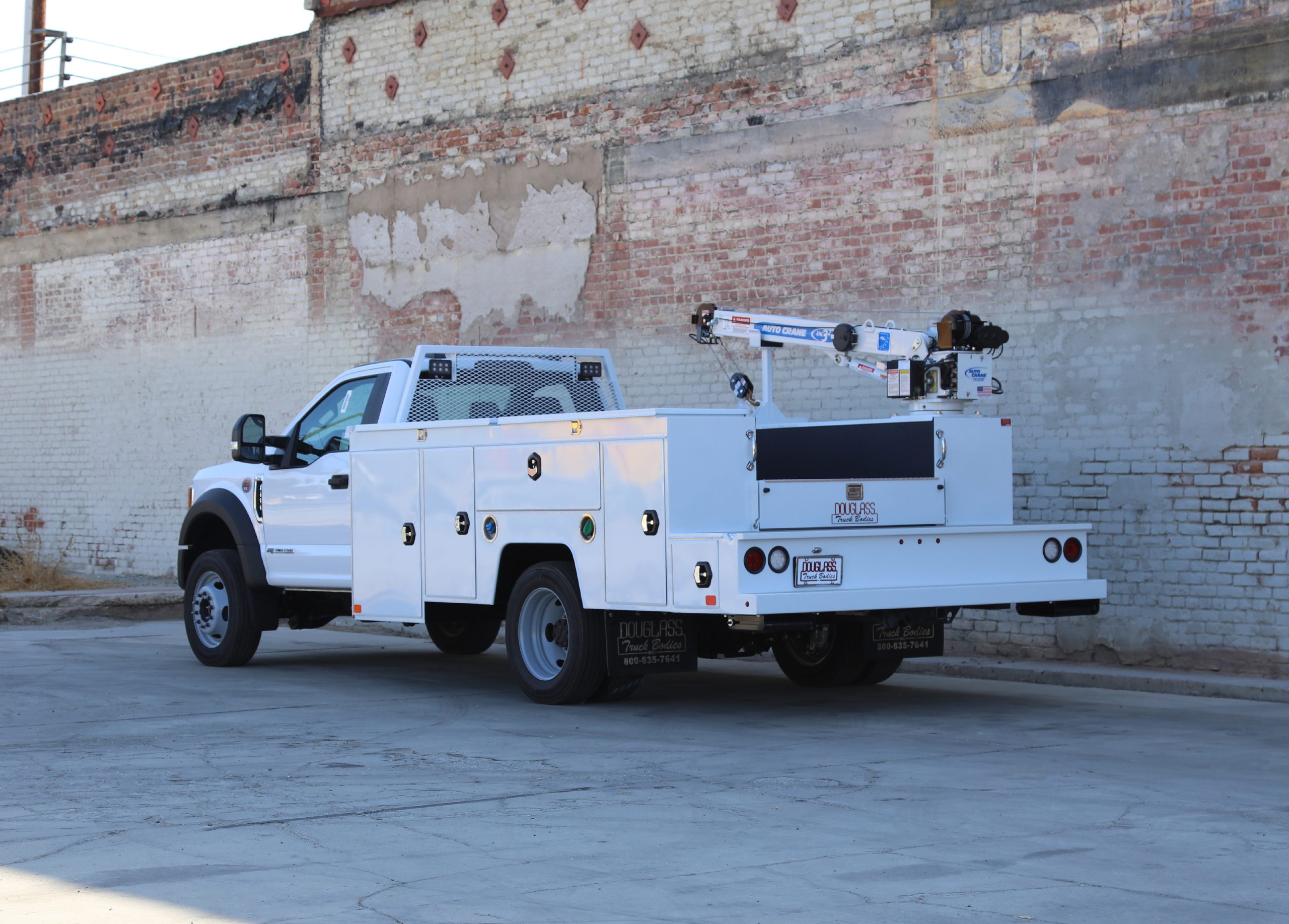10′ Douglass Maximizer Crane Body built for a 60″ cab-to-axle DRW Ford F450. The body is equipped with an Auto Crane 4004EH-HW, a 4,000lb capacity crane with 360 degree continuous power rotation. The body has been painted to color match the customers cab.