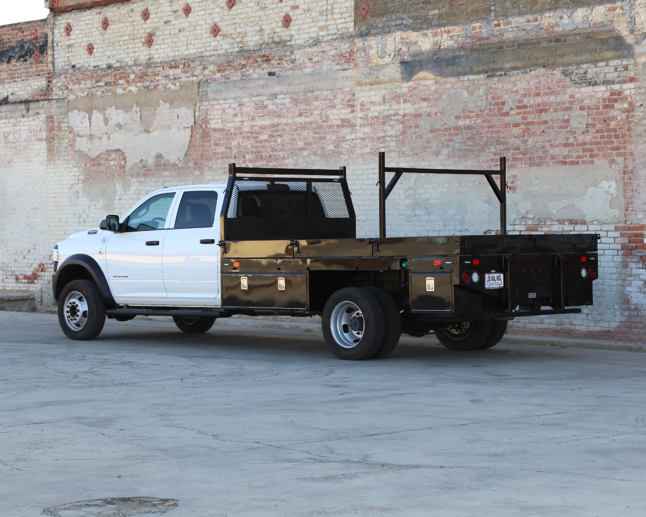 8′ Douglass Steel tread plate built for a 56″ cab-to-axle SRW Chevy 2500. The bed features hinging steel side rails.