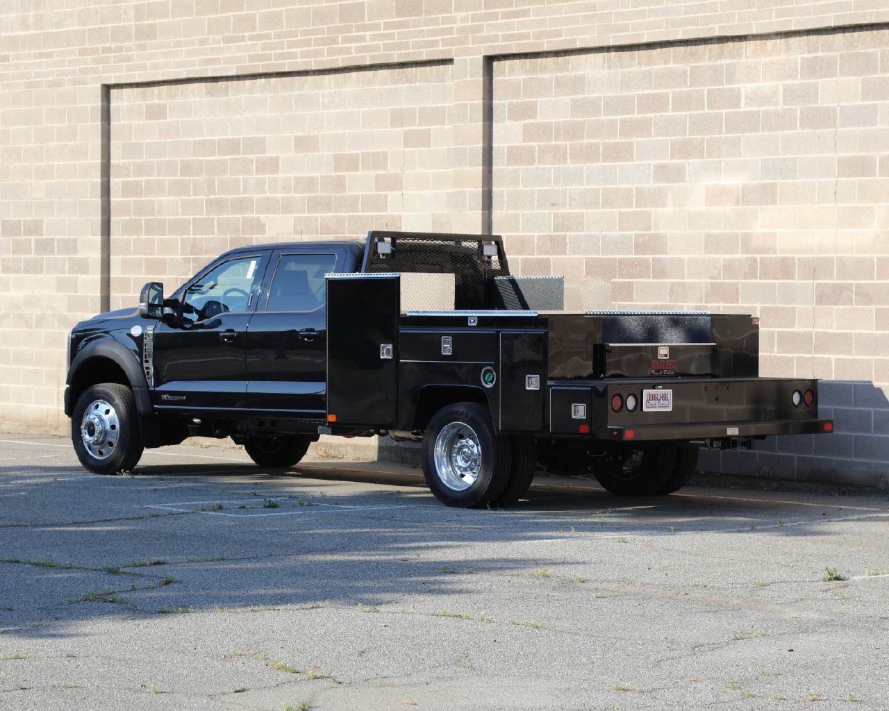 8′ Douglass Service Body with built in flip-top boxes, built for a 56″ cab-to-axle SRW Ford F250. Fitted with an oxygen/acetylene bottle holder with a custom cut out above that compartment into the flip-top area to allow extra bottle height as well as a compartment partition for storage of welding tools. This body also has mechanics drawers to store tools and other items, adjustable shelving to accommodate many storage needs, and open compartments on the horizontals for larger item storage.