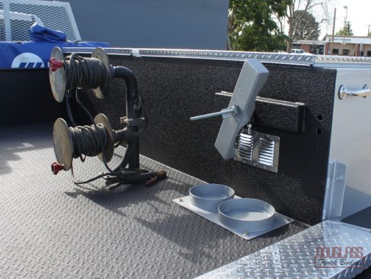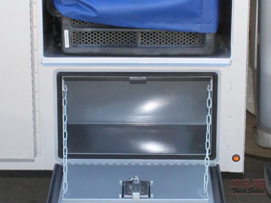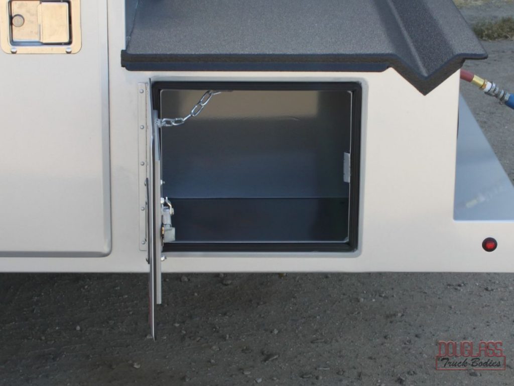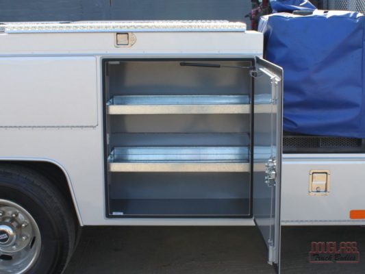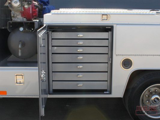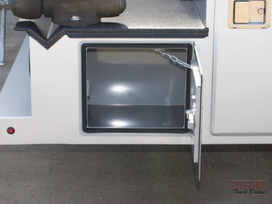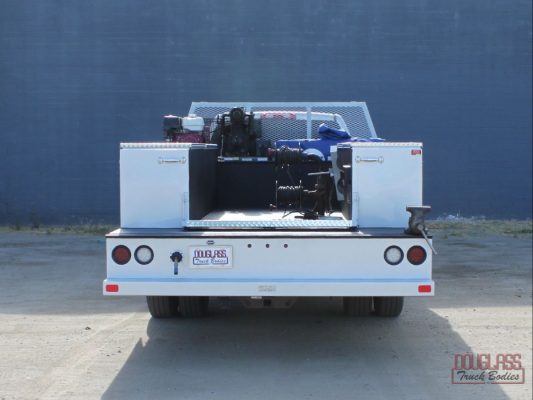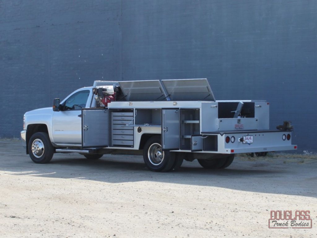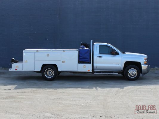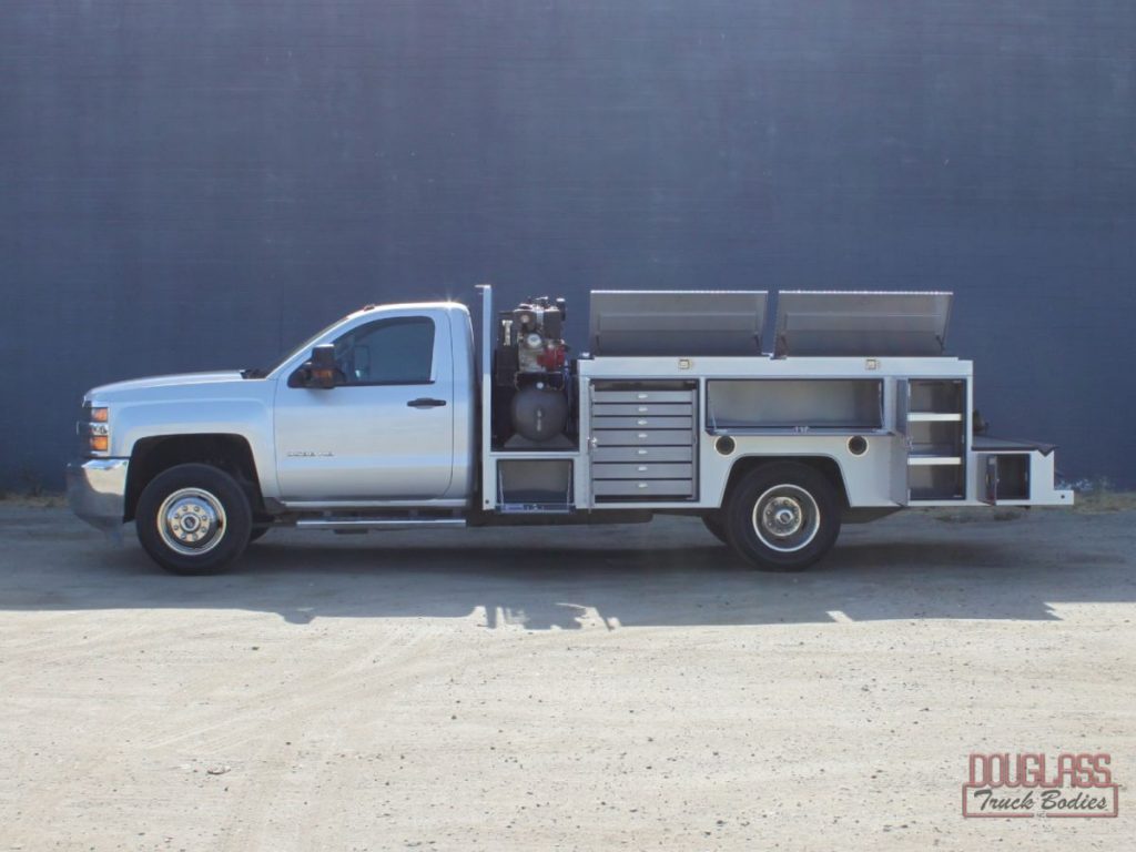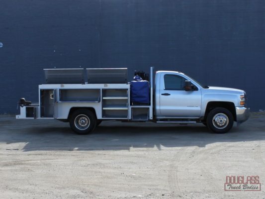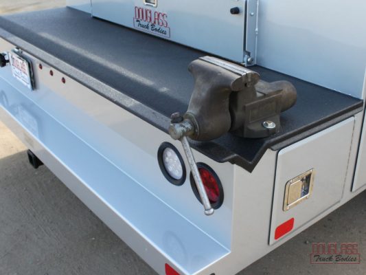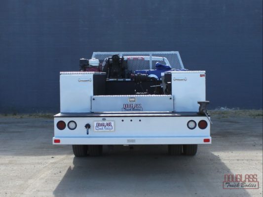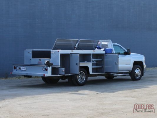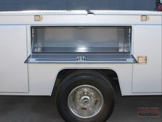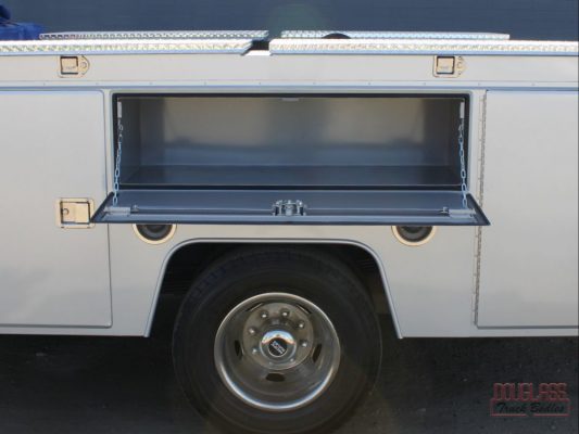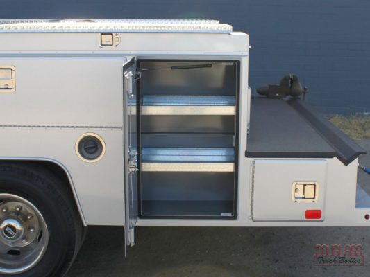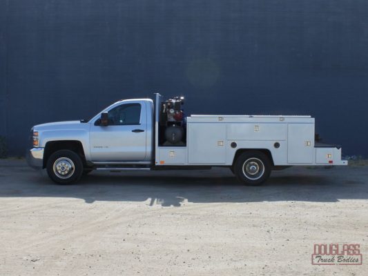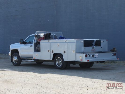 9′ Douglass Service Body with built in flip-top boxes, built for a 84″ cab-to-axle DRW Chevrolet 3500 Narrow Track. Made to accommodate the customers welder, compressor, and existing lead reel. Made with oxygen and acetylene bottle mounts in the cargo area and a vented compartment in the curbside rear. Additionally this body received mechanics drawers, fully adjustable shelving, and a front work platform for mounting equipment.