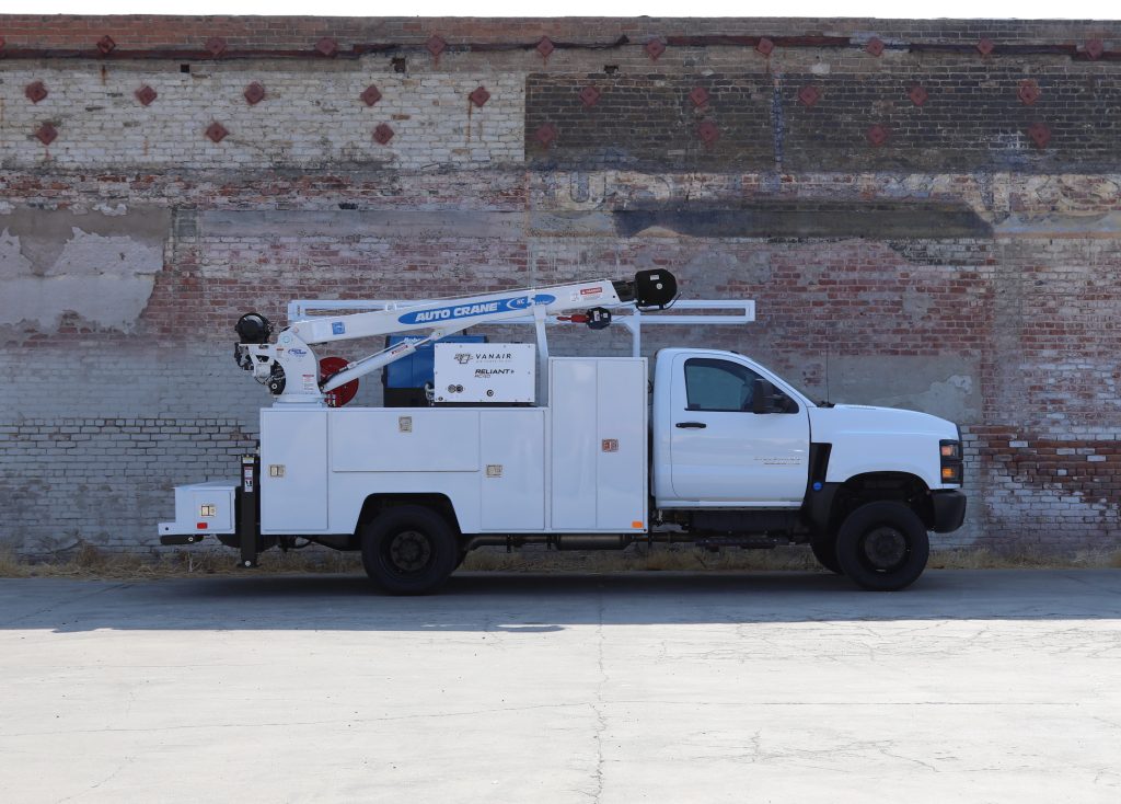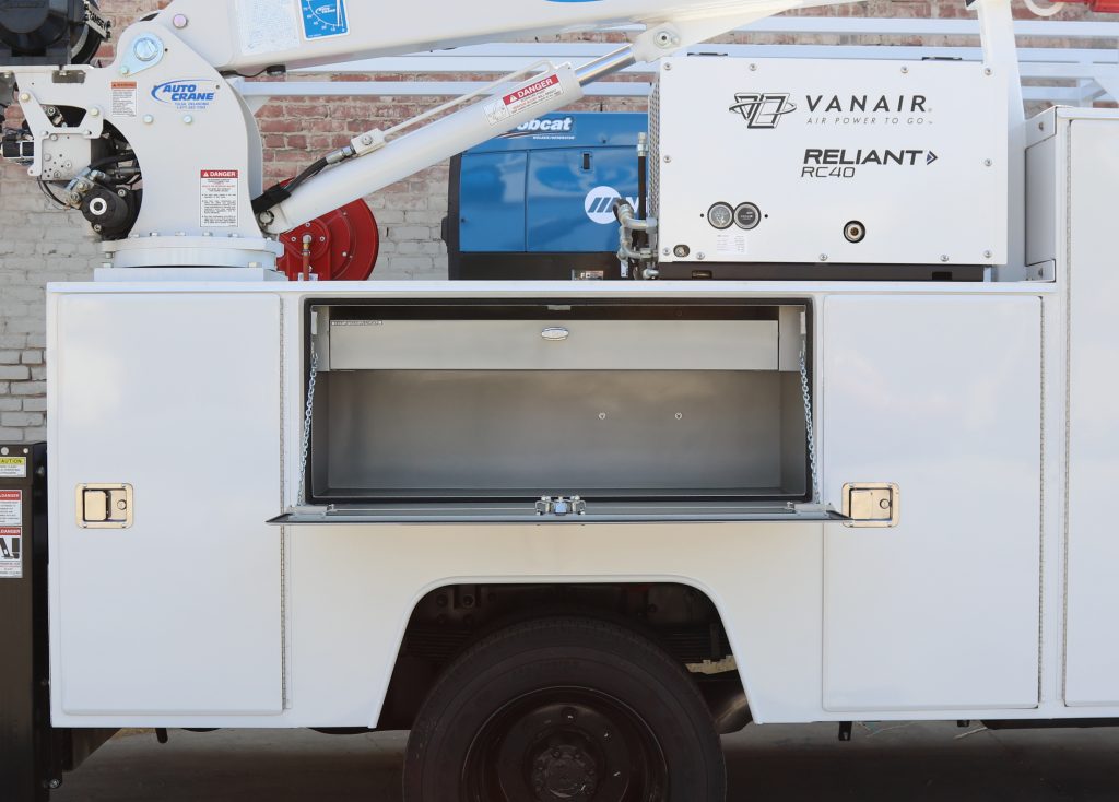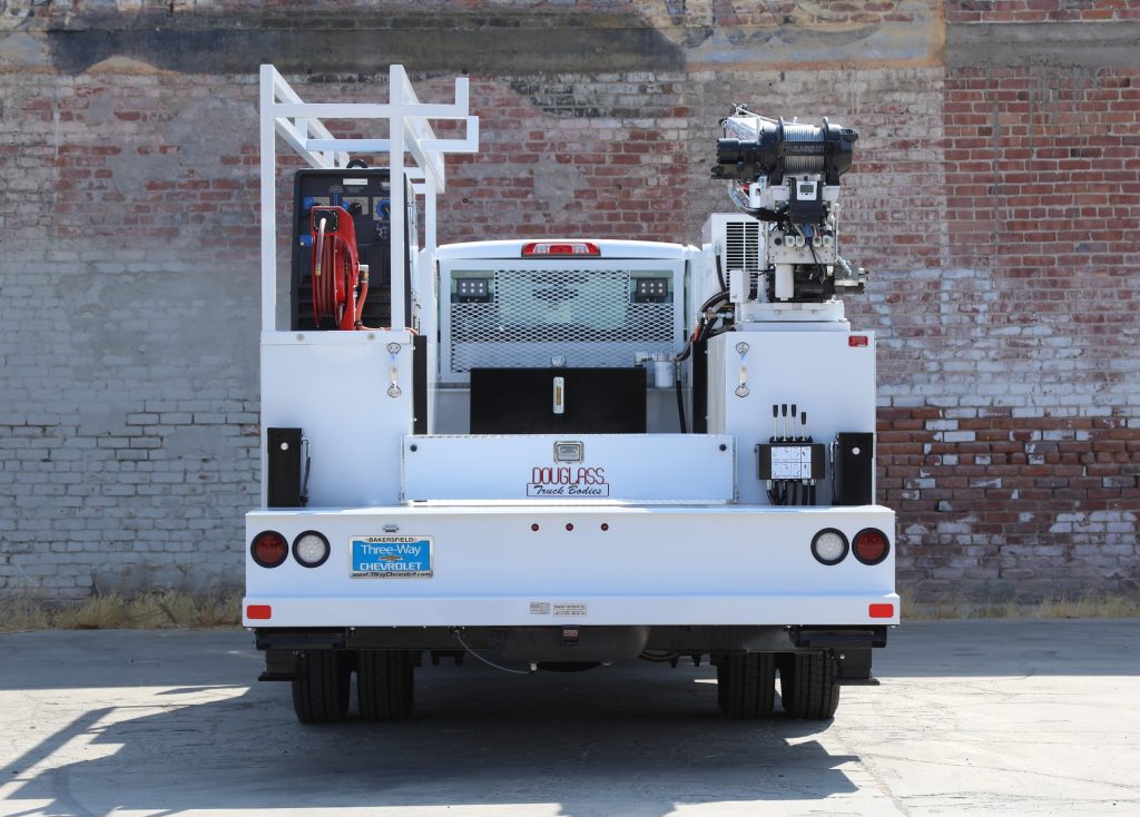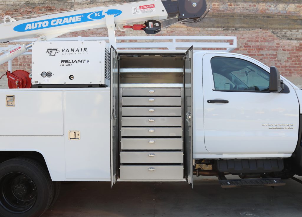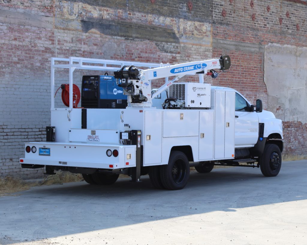 11′ Douglass Maximizer Crane Body built for an 84″ cab-to-axle DRW Chevy 5500 with an HC-5 Auto Crane with FM remote and full hydraulic outriggers. This body has raised front compartments for additional storage space and a wide assortment of drawers and shelving throughout the truck. It also comes equipped with a Vanair RC40 compressor, 19 gallon air receiver tank, 45 gal hydraulic reservoir tank, Miller Bobcat welder, and side mount pipe rack.