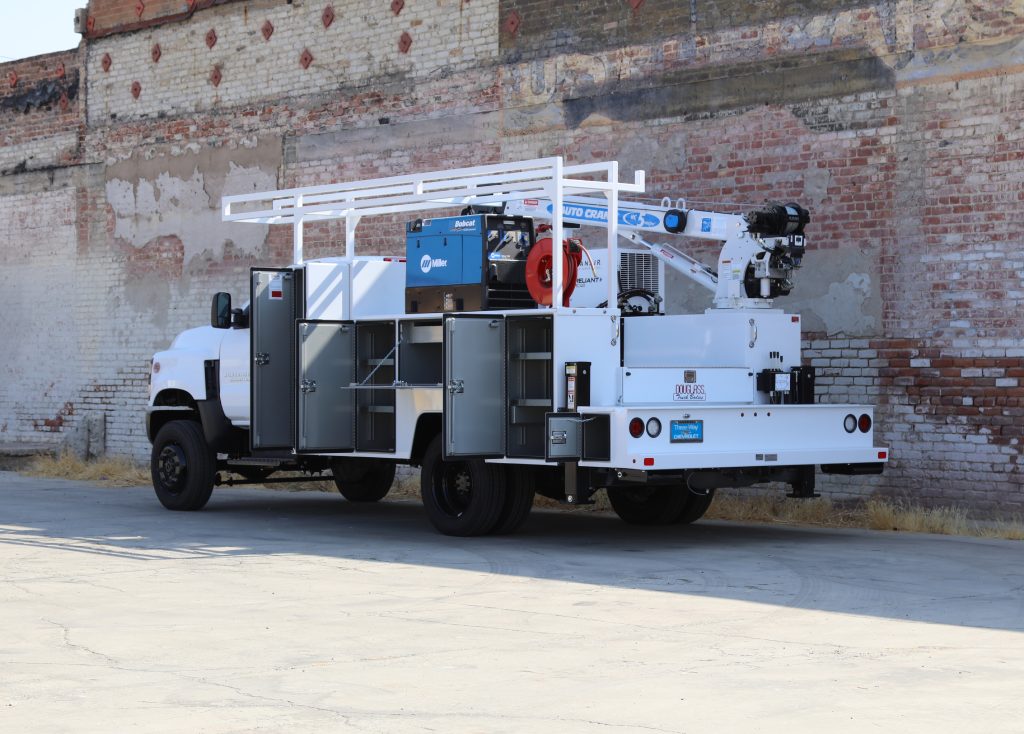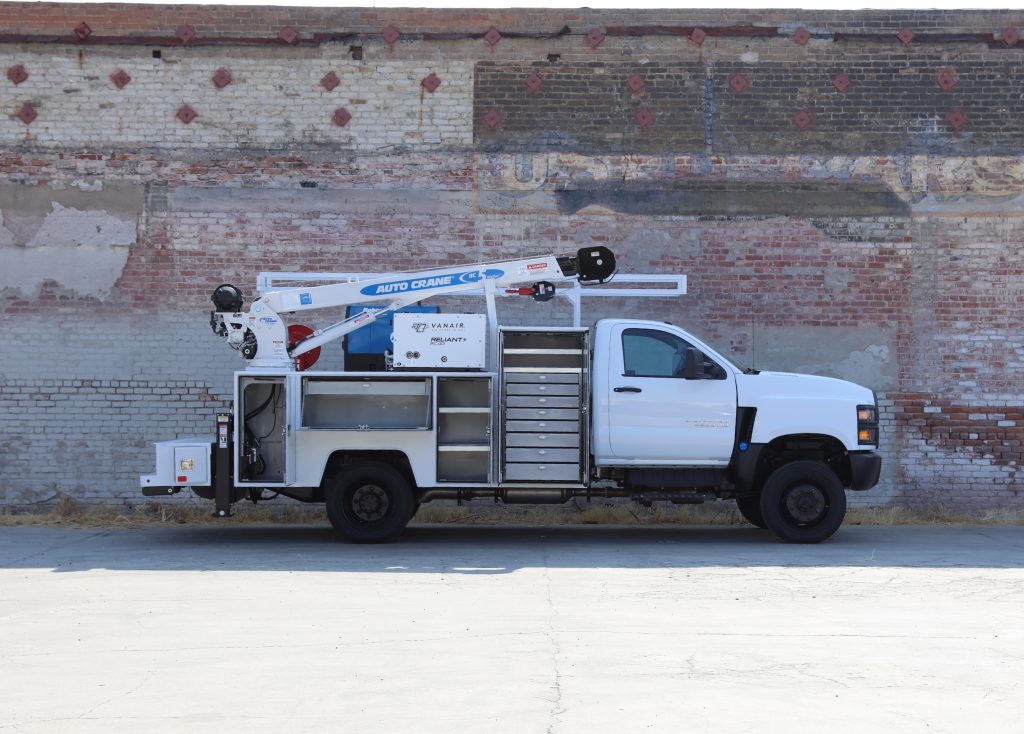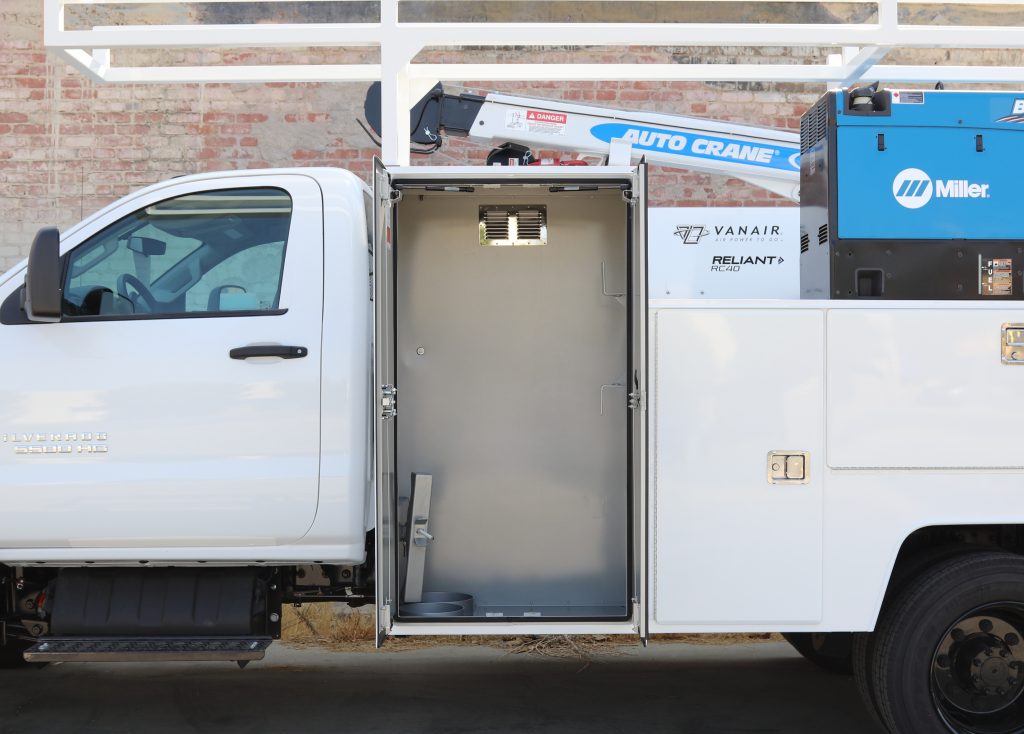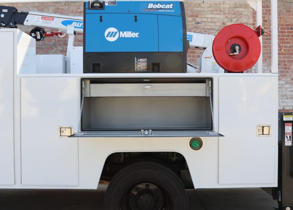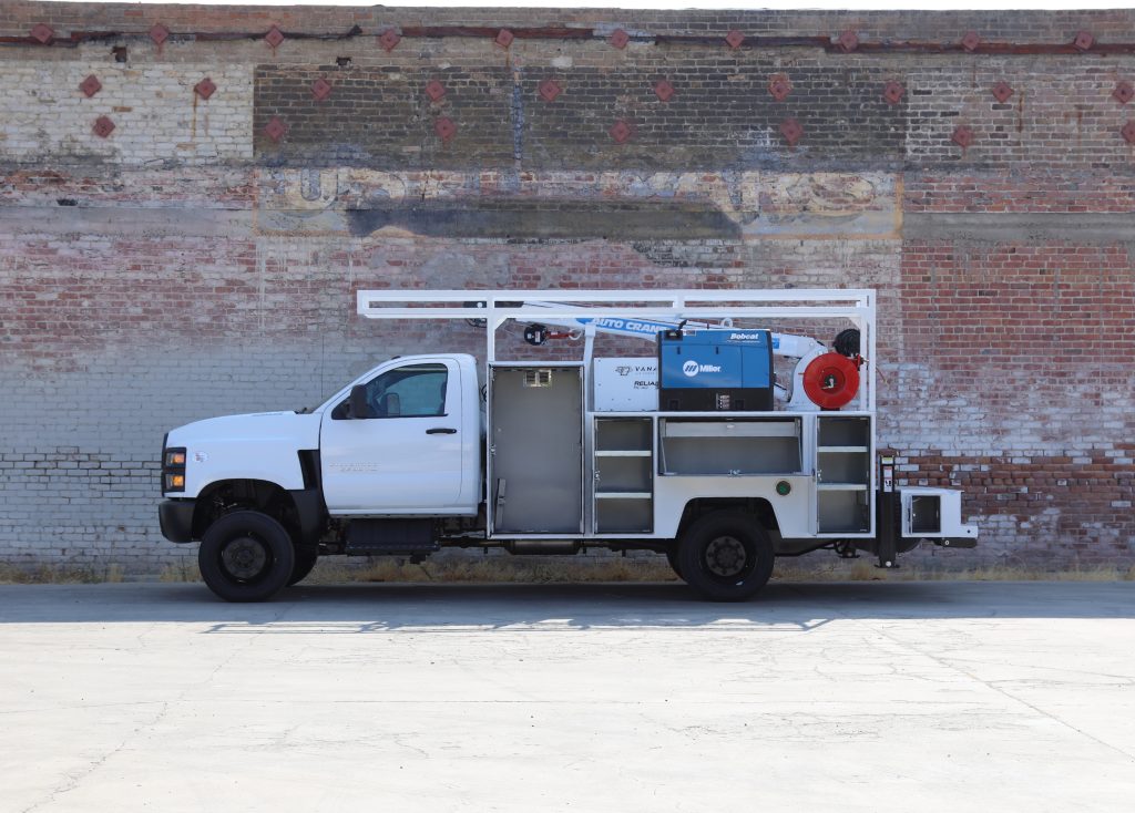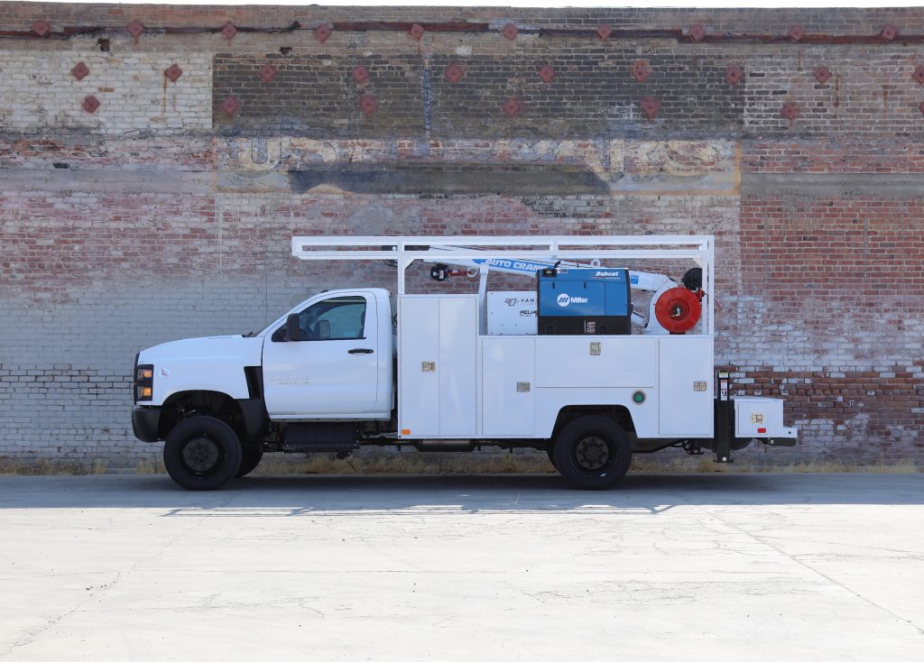 11′ Douglass Maximizer Crane Body built for an 84″ cab-to-axle DRW Chevy 5500 with an HC-5 Auto Crane with FM remote and full hydraulic outriggers. This body has raised front compartments for additional storage space and a wide assortment of drawers and shelving throughout the truck. It also comes equipped with a Vanair RC40 compressor, 19 gallon air receiver tank, 45 gal hydraulic reservoir tank, Miller Bobcat welder, and side mount pipe rack.