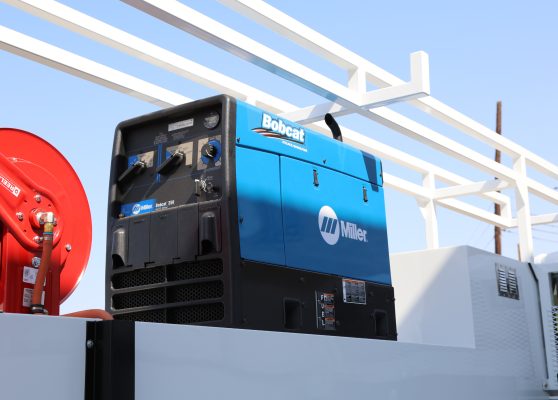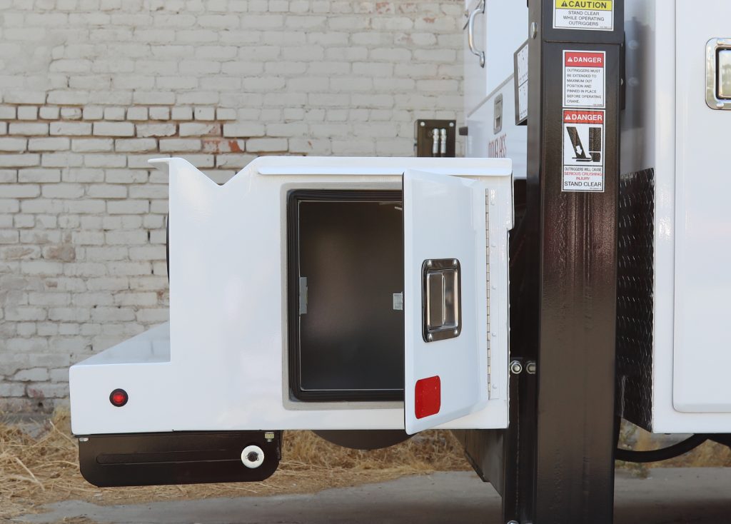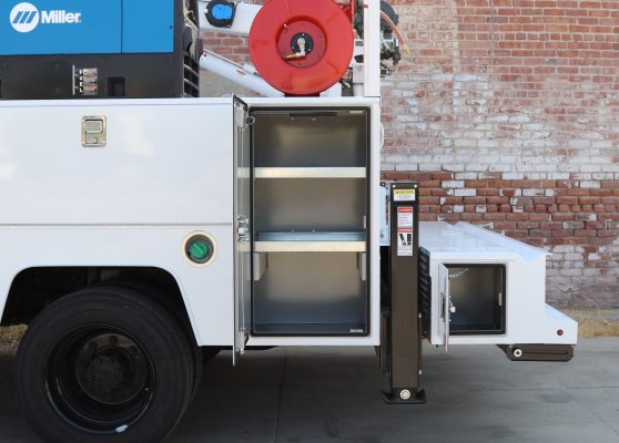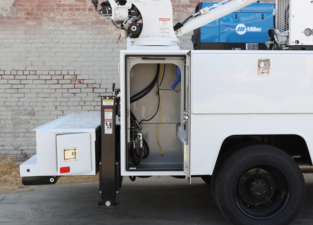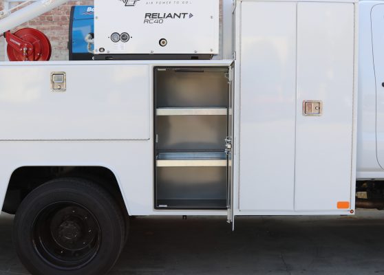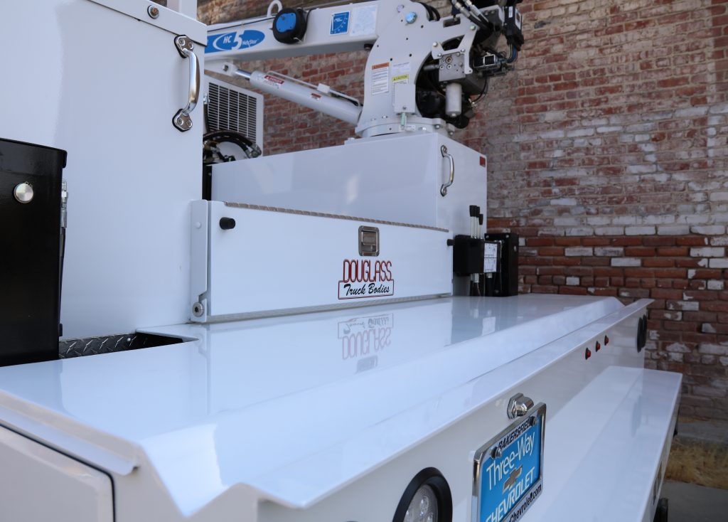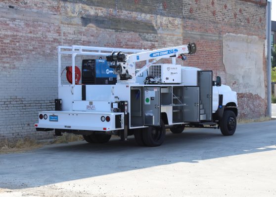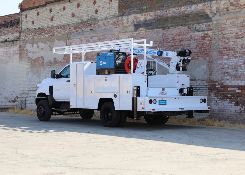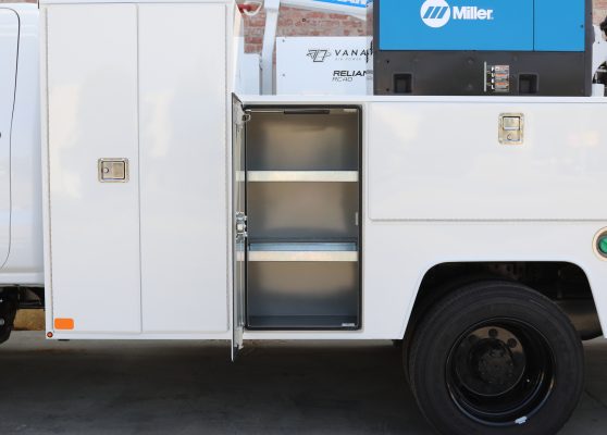 11′ Douglass Maximizer Crane Body built for an 84″ cab-to-axle DRW Chevy 5500 with an HC-5 Auto Crane with FM remote and full hydraulic outriggers. This body has raised front compartments for additional storage space and a wide assortment of drawers and shelving throughout the truck. It also comes equipped with a Vanair RC40 compressor, 19 gallon air receiver tank, 45 gal hydraulic reservoir tank, Miller Bobcat welder, and side mount pipe rack.