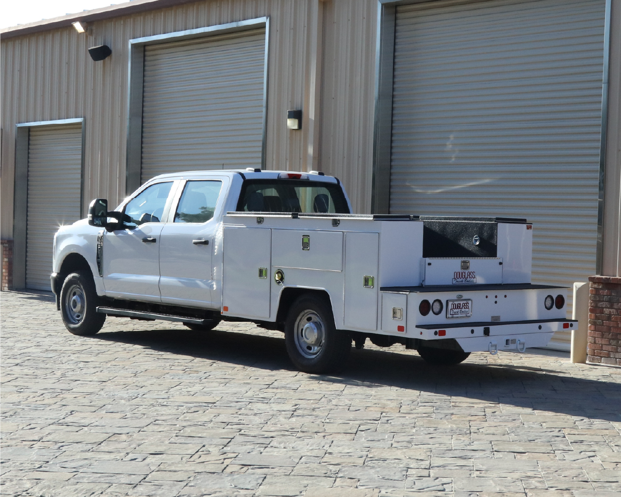 9′ Douglass Service Body with built in flip-top boxes, built for a 56″ cab-to-axle DRW Ford F350. This truck features adjustable shelving, a “V” notch work platform, and an oxy/acet compartment on its curb side. For body protection, it has aluminum diamond plate splash guards, overlay, and kickplate, in addition to Arma coating on its bumper and inside its cargo bed.