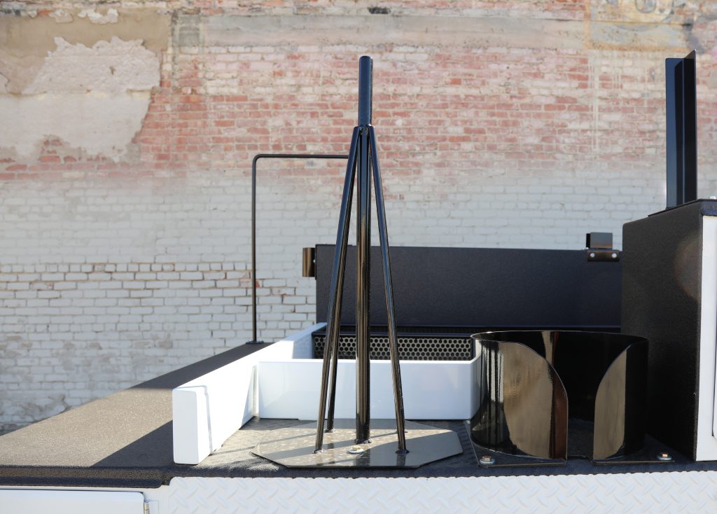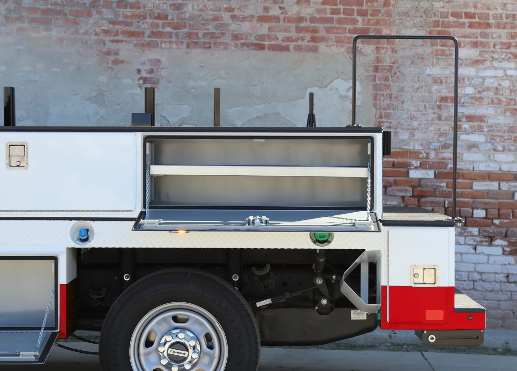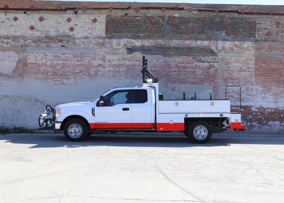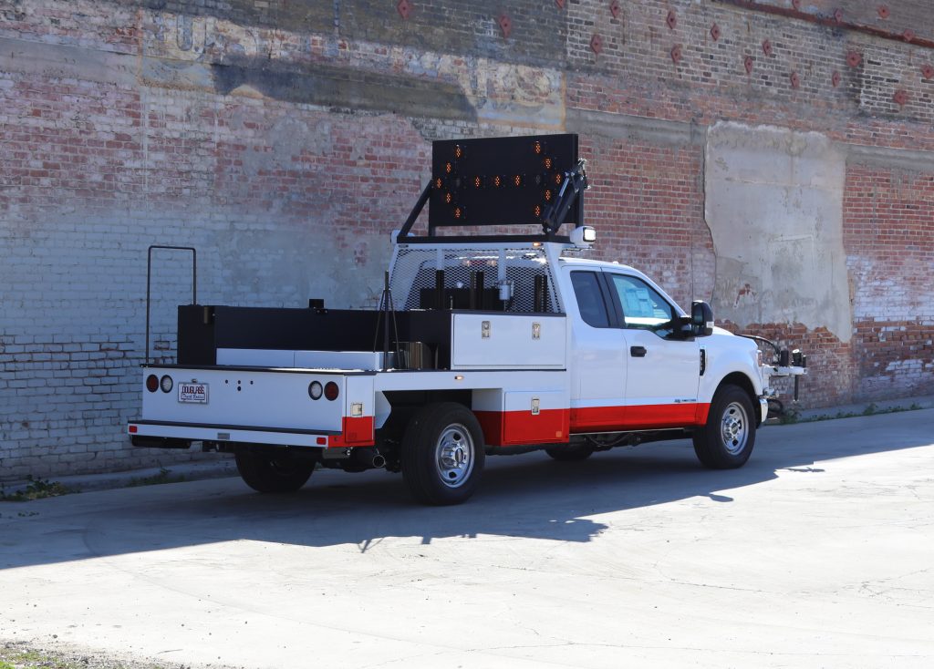 8′ Douglass Diamond Plate Flatbed built for a 56″ cab-to-axle SRW Ford F350. This truck features upper and lower boxes with adjustable shelving and interior lighting. A rear work platform includes an aerial grab bar, fold-down steps, and removable side rails for improved access and safety. The truck is equipped with an extensive lighting package, including amber micro-pulse flashers, Go-Lights with programmable remote controllers, and a Wanco WFB1805-LSA 15-light arrow board capable of folding down 180 degrees when not in use. A Wachs ERV Automated Valve Operator is mounted at the front of the truck and is operated using an HC-100 handheld controller with Bluetooth capability. Additional cargo management features include a custom open-top basket in the cargo area for longer equipment/materials, along with a cone holder, shovel holder, and water can holder. For added protection and durability, bedliner was applied to the cargo area, rear work platform, and bumper.