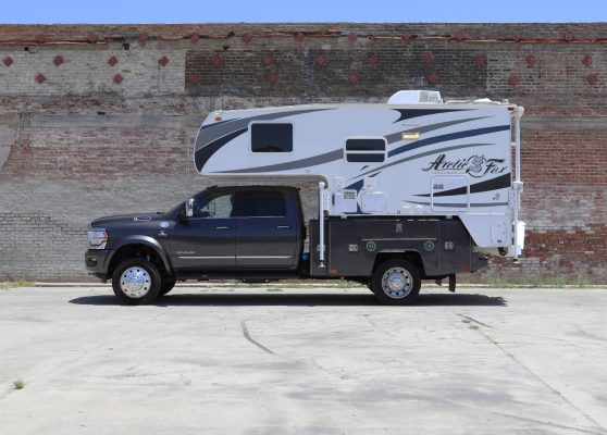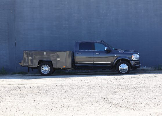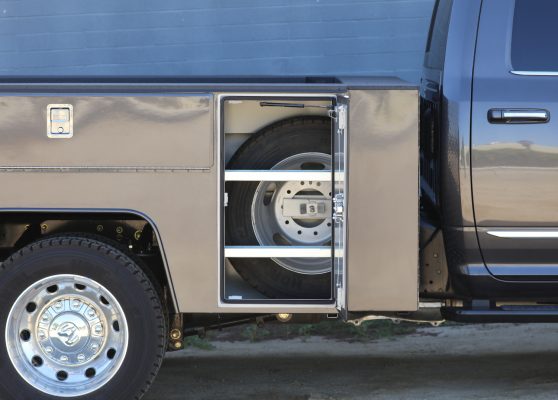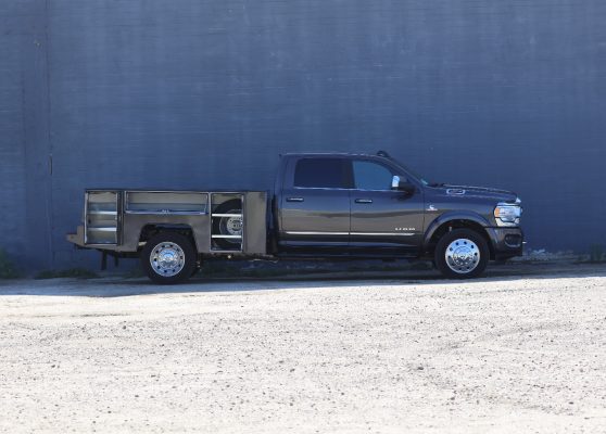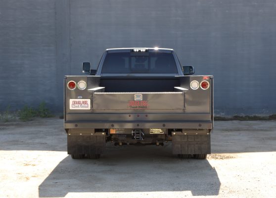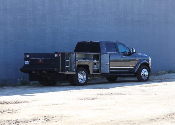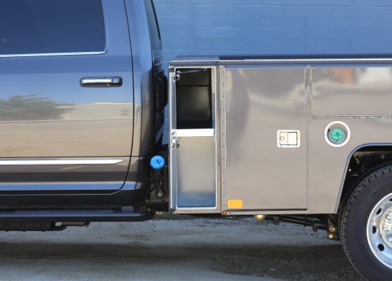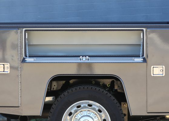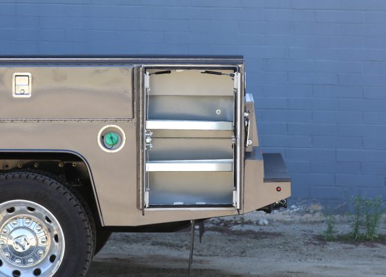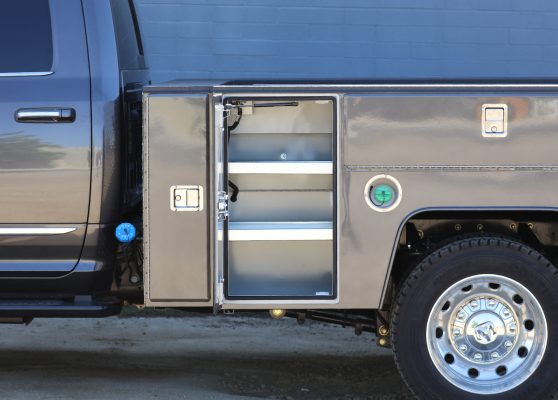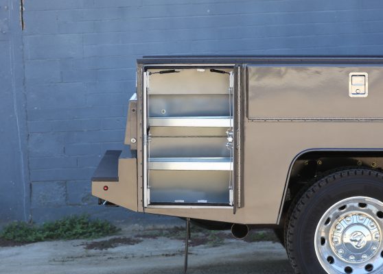 This 9′ Douglass Camper Body was designed to fit seamlessly between an Arctic Fox camper and a Ram 5500 chassis. It features fully adjustable shelving throughout multiple compartments, a spare tire mount in the first curbside compartment, and an enclosed front storage space designed to hold the tailgate or other long gear when the camper is installed. The rear compartments are tapered inward to clear gooseneck and 5th-wheel trailers and include barn-style doors that allow access even in tight spaces. Precision notch-outs at the front accommodate the camper’s jack stands, while additional cutouts inside the cargo area ensure a perfect, secure fit of the camper itself. Integrated camper tie-downs keep everything locked in place during travel. For added durability, the body is protected with aluminum diamond plate splash guards, along with Arma coating applied to the cargo area, compartment tops, and bumper surfaces.