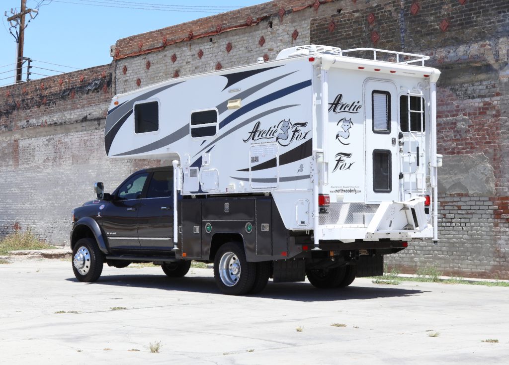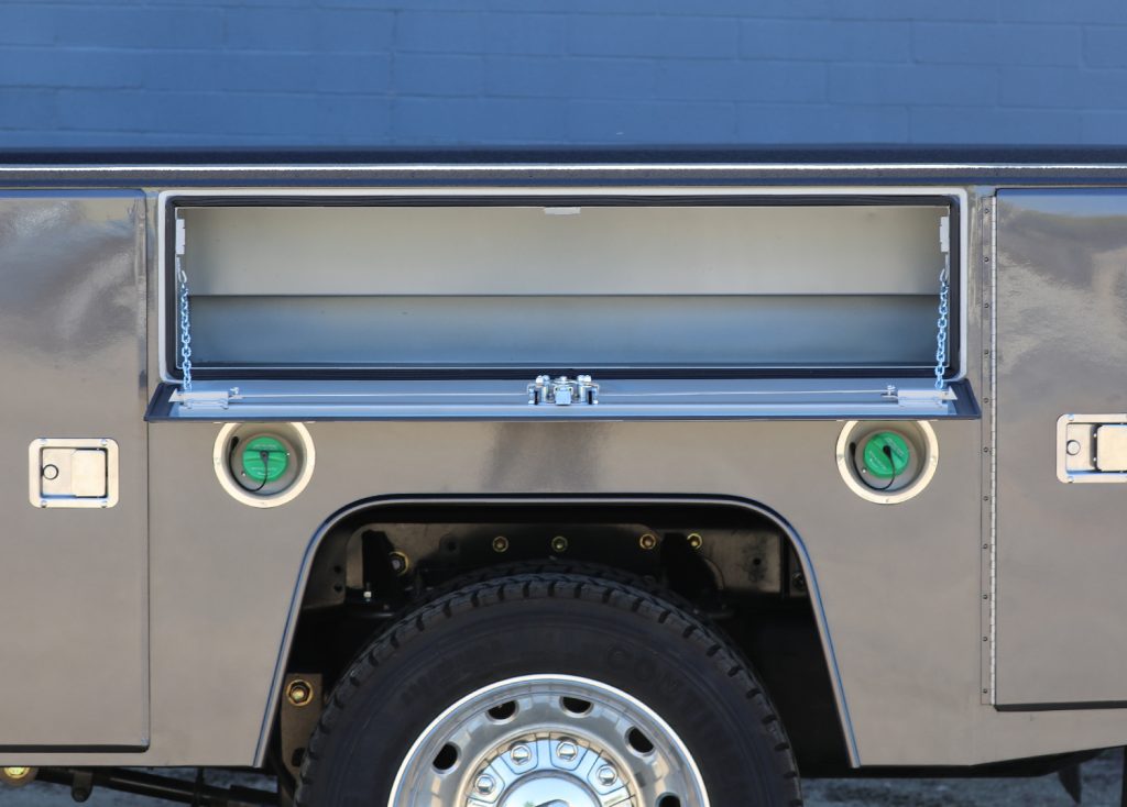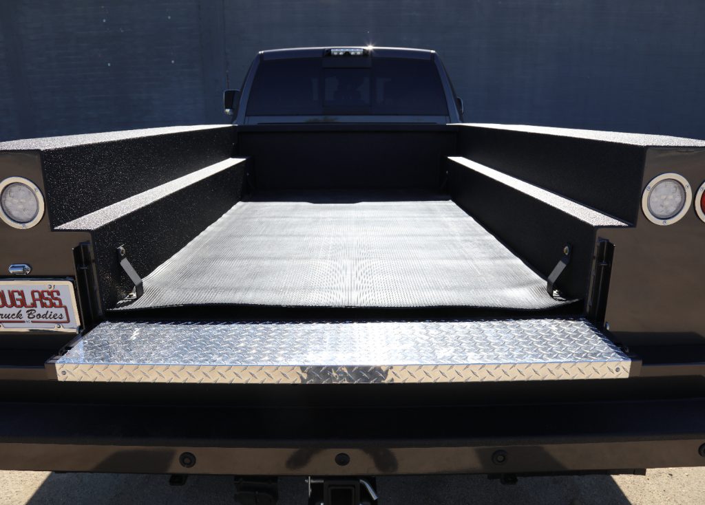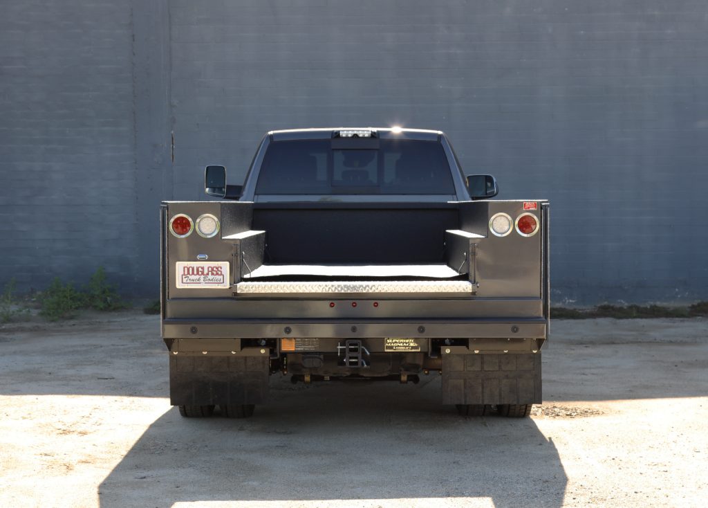 This 9′ Douglass Camper Body was designed to fit seamlessly between an Arctic Fox camper and a Ram 5500 chassis. It features fully adjustable shelving throughout multiple compartments, a spare tire mount in the first curbside compartment, and an enclosed front storage space designed to hold the tailgate or other long gear when the camper is installed. The rear compartments are tapered inward to clear gooseneck and 5th-wheel trailers and include barn-style doors that allow access even in tight spaces. Precision notch-outs at the front accommodate the camper’s jack stands, while additional cutouts inside the cargo area ensure a perfect, secure fit of the camper itself. Integrated camper tie-downs keep everything locked in place during travel. For added durability, the body is protected with aluminum diamond plate splash guards, along with Arma coating applied to the cargo area, compartment tops, and bumper surfaces.