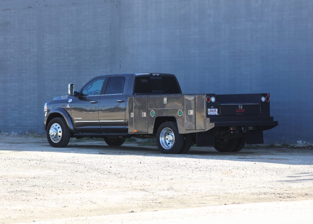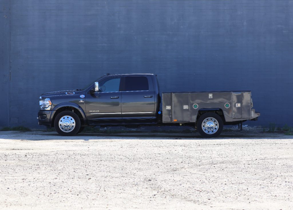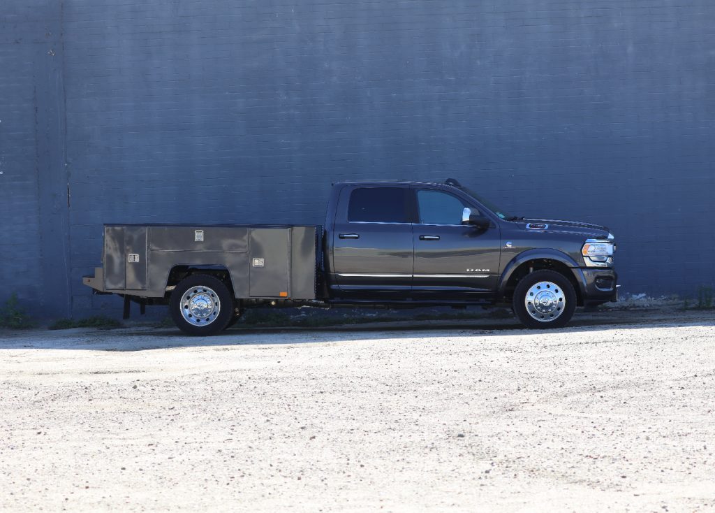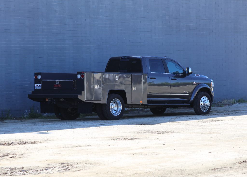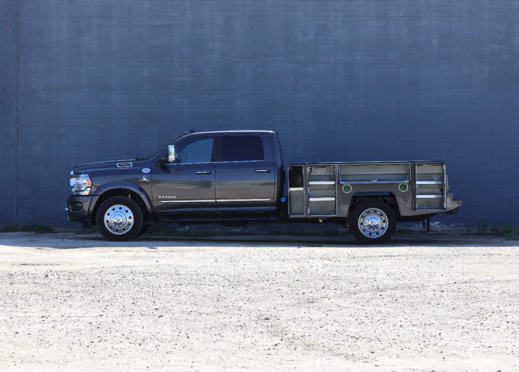 This 9′ Douglass Camper Body was designed to fit seamlessly between an Arctic Fox camper and a Ram 5500 chassis. It features fully adjustable shelving throughout multiple compartments, a spare tire mount in the first curbside compartment, and an enclosed front storage space designed to hold the tailgate or other long gear when the camper is installed. The rear compartments are tapered inward to clear gooseneck and 5th-wheel trailers and include barn-style doors that allow access even in tight spaces. Precision notch-outs at the front accommodate the camper’s jack stands, while additional cutouts inside the cargo area ensure a perfect, secure fit of the camper itself. Integrated camper tie-downs keep everything locked in place during travel. For added durability, the body is protected with aluminum diamond plate splash guards, along with Arma coating applied to the cargo area, compartment tops, and bumper surfaces.