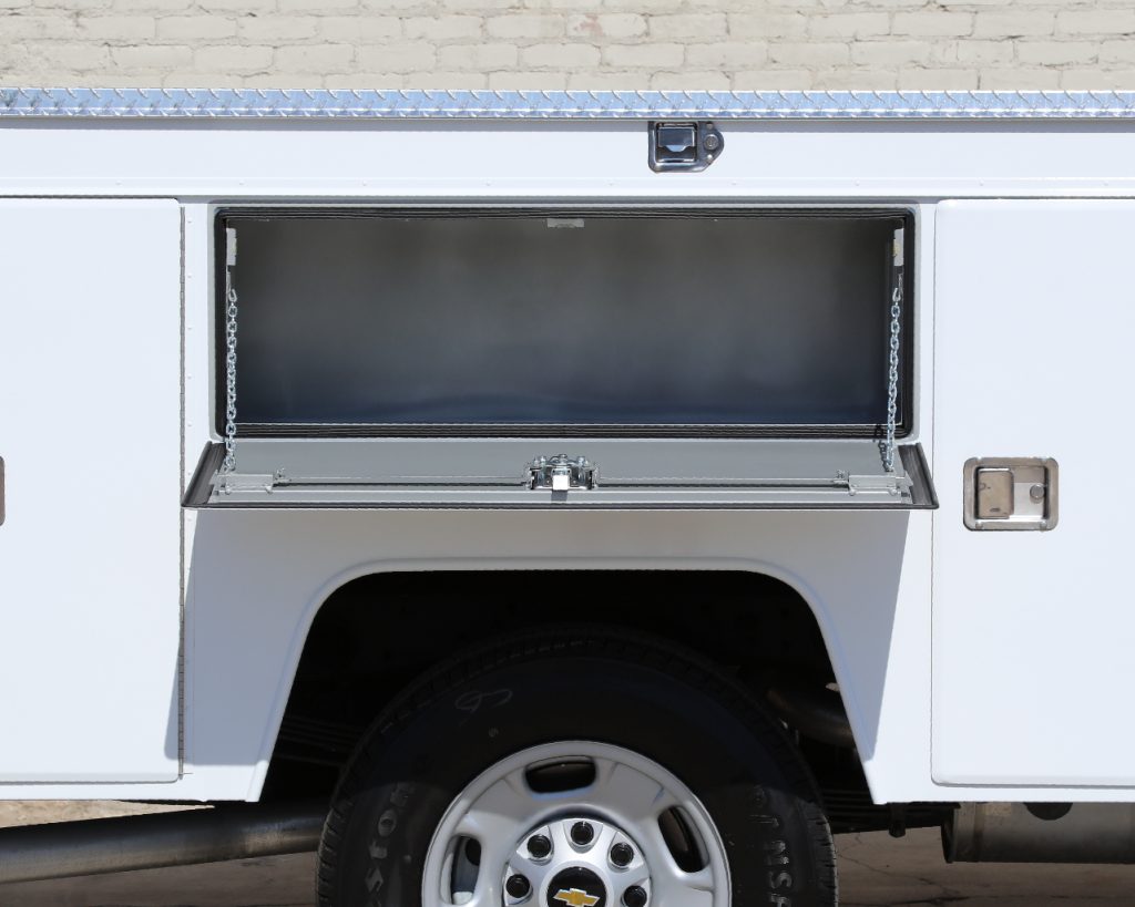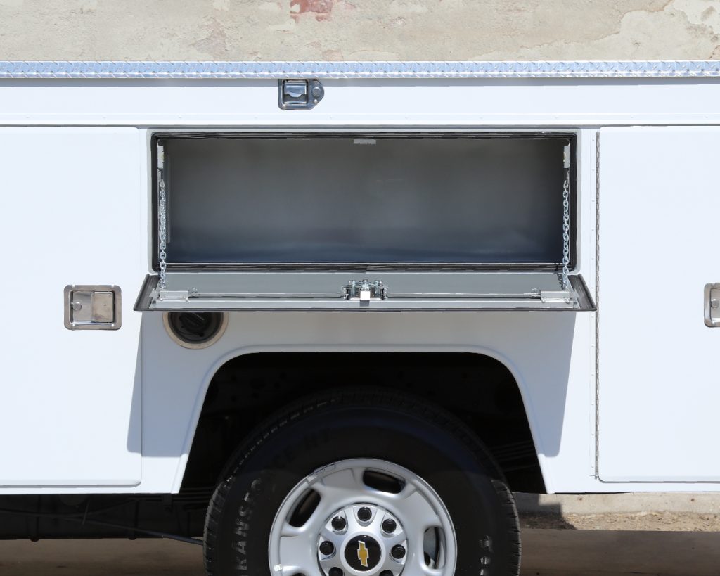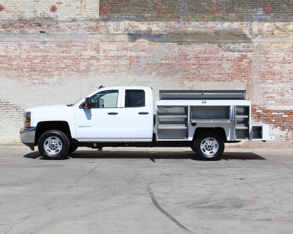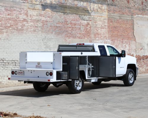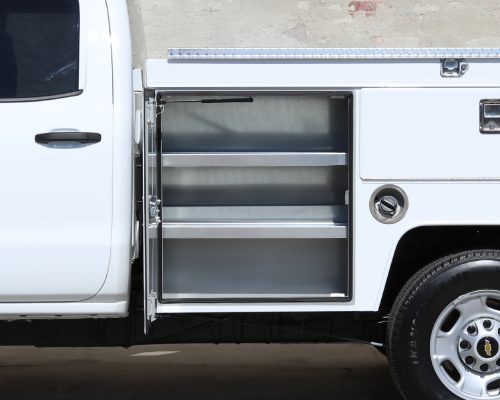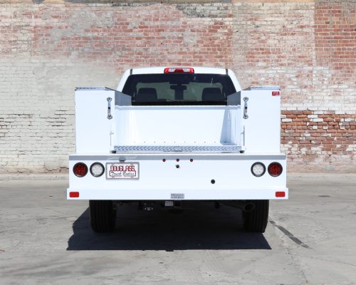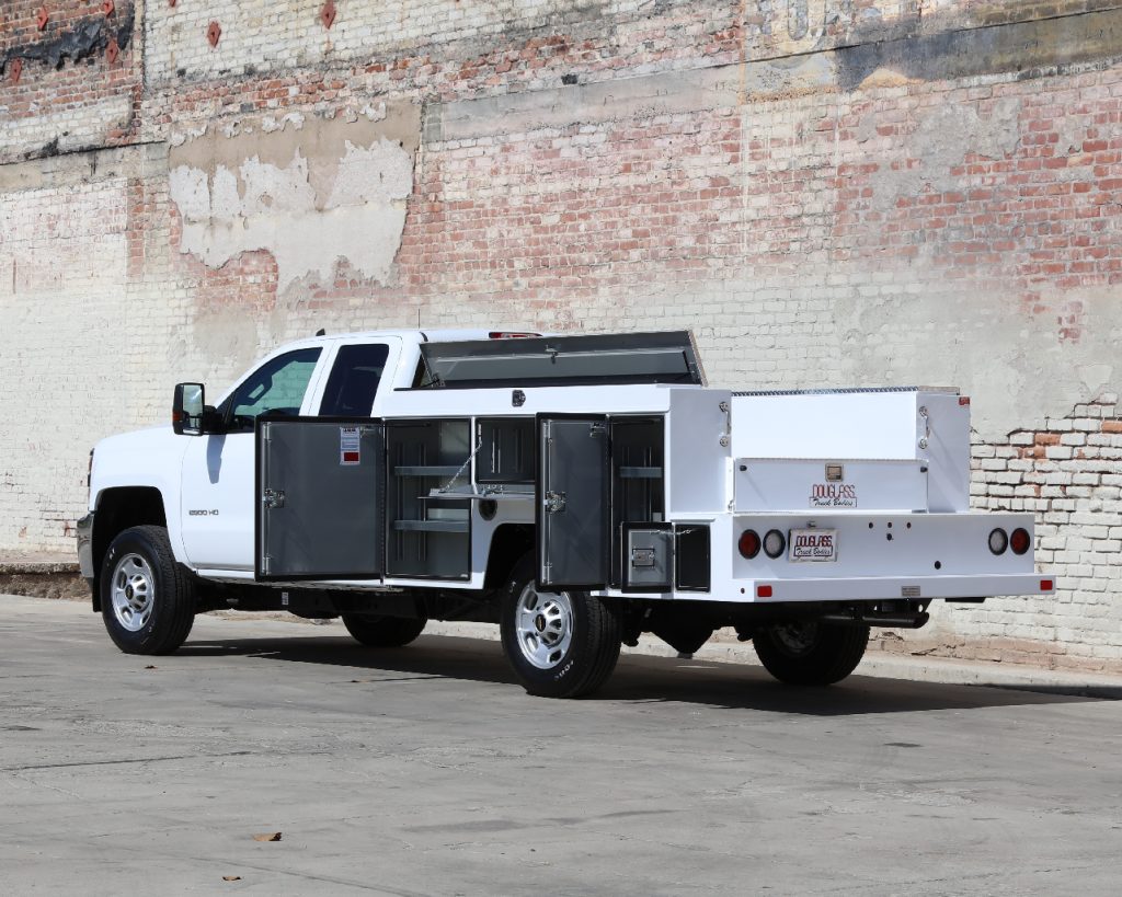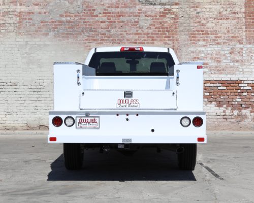 8′ Douglass Truck Body with flip tops built for a 56″ cab-to-axle SRW Chevy 2500. This build features adjustable shelving in most compartments, a standard towing package with 2″ hitch, and a rear work platform with a V-notch for added functionality. The front curb side compartment includes oxy/acetylene bottle well with clamps and integrated hose holder, making it well suited for welding applications. For added durability and protection, aluminum diamond plating was installed on the front panels and flip-top lids.