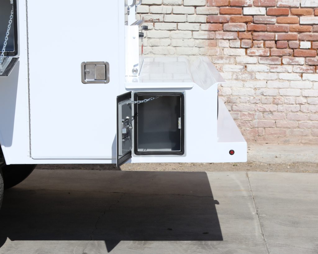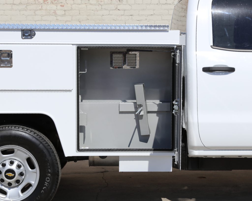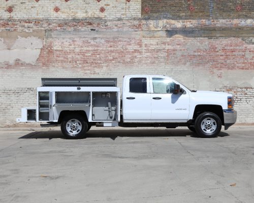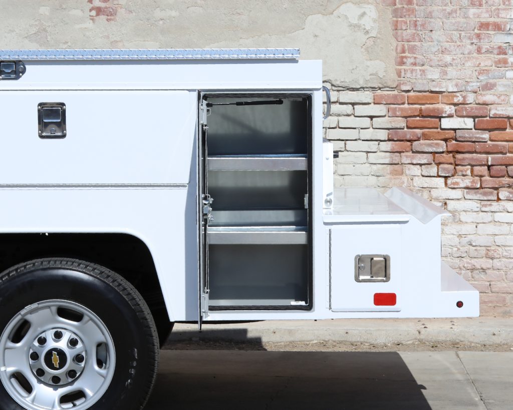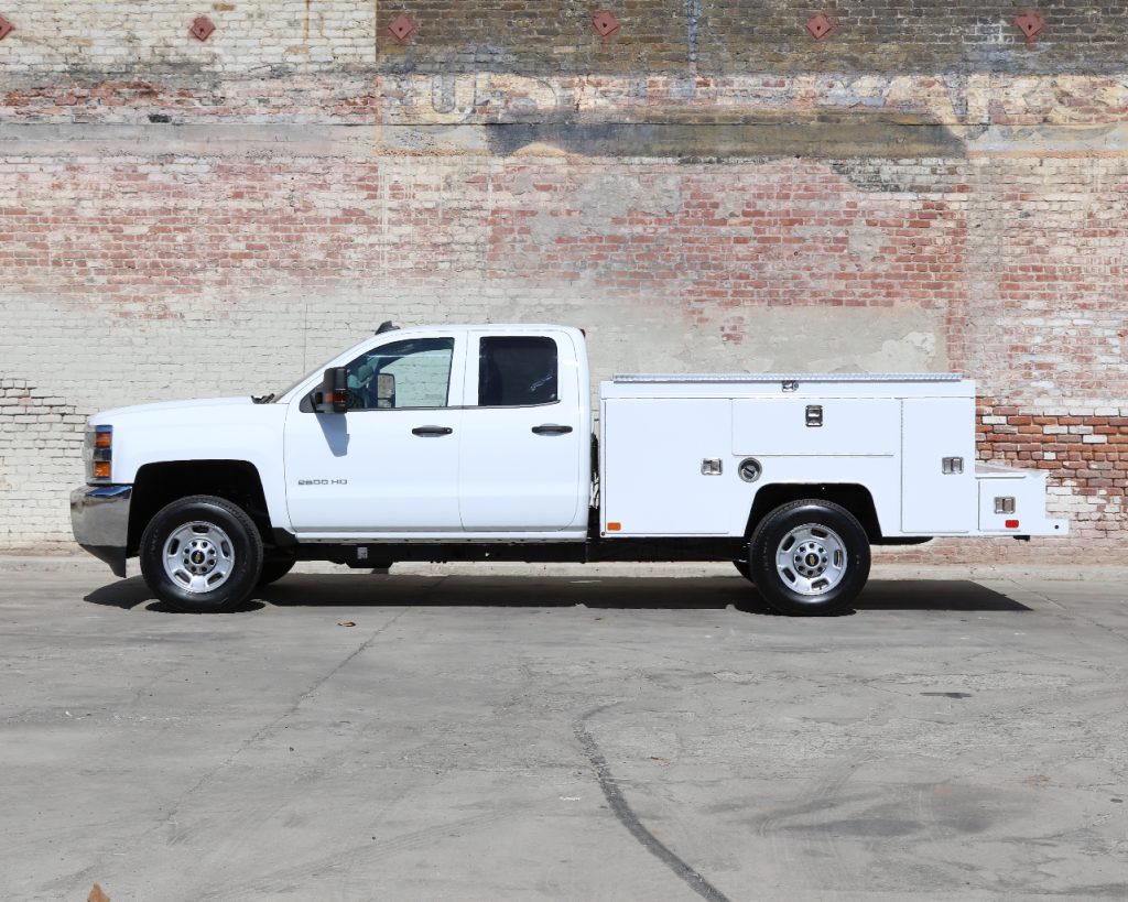 8′ Douglass Truck Body with flip tops built for a 56″ cab-to-axle SRW Chevy 2500. This build features adjustable shelving in most compartments, a standard towing package with 2″ hitch, and a rear work platform with a V-notch for added functionality. The front curb side compartment includes oxy/acetylene bottle well with clamps and integrated hose holder, making it well suited for welding applications. For added durability and protection, aluminum diamond plating was installed on the front panels and flip-top lids.