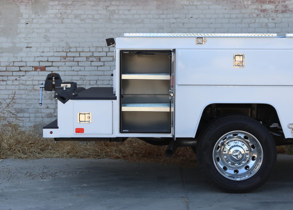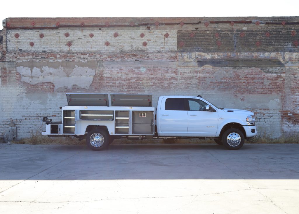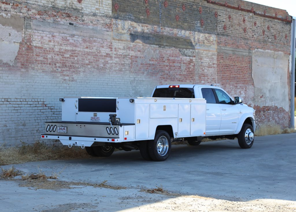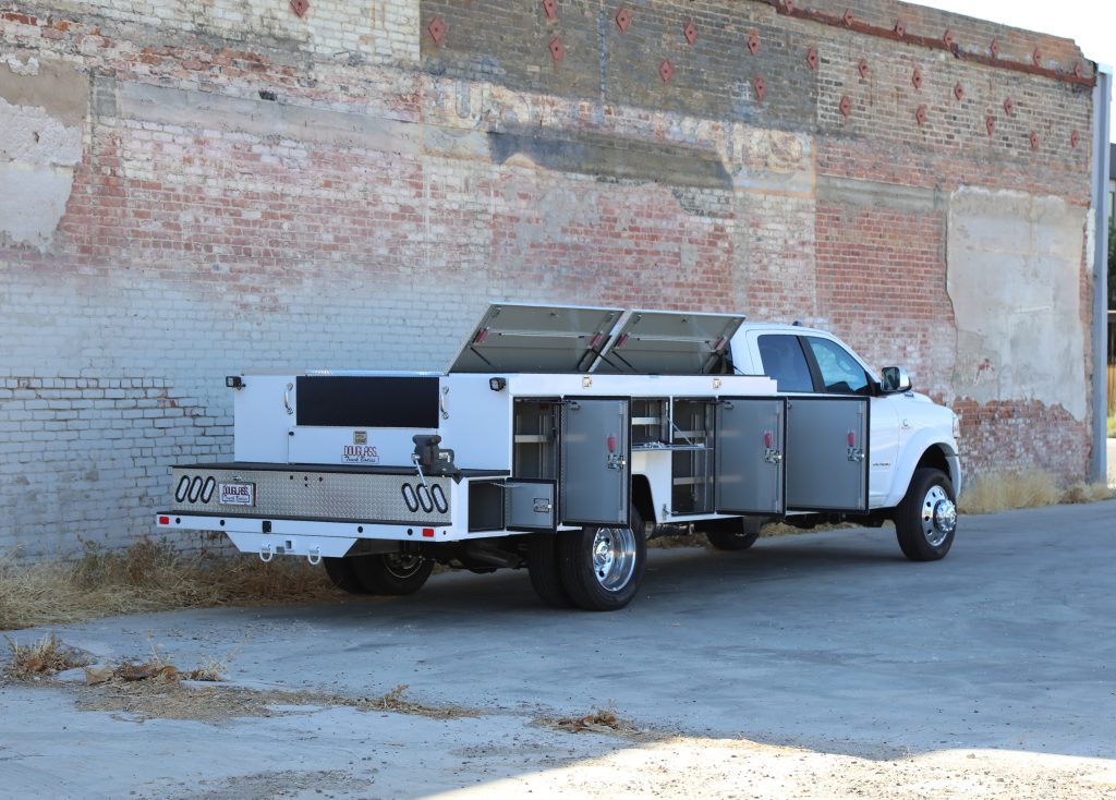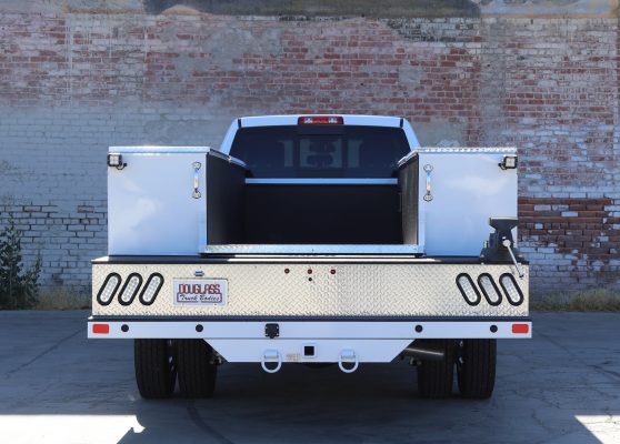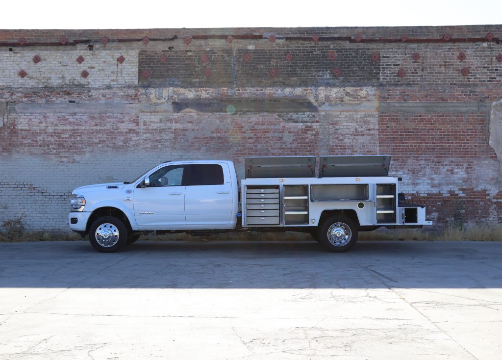 11′ Douglass Truck Body with Flip Tops built for an 84″ cab-to-axel DRW Ram 5500. This truck features adjustable shelving, mechanic’s drawers, and LED strip lighting throughout the compartments. The front curbside compartment is upfitted with hose holder and oxy/acetylene bottle clamp. The rear work platform is equipped with a customer-supplied vise, a through-compartment, and Rigid LED lights for added functionality and visibility. A pop-lock system provides convenient, centralized locking. Additional features include aluminum diamond plate overlays on the compartment tops and kick plate, along with bedliner applied to the cargo area, work platform, and bumper for added durability and protection.