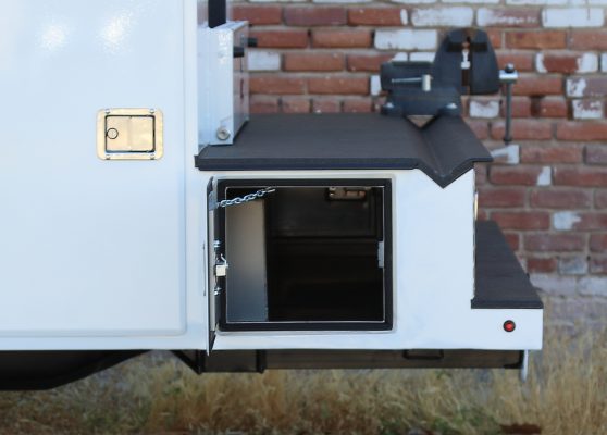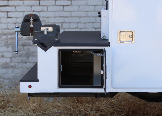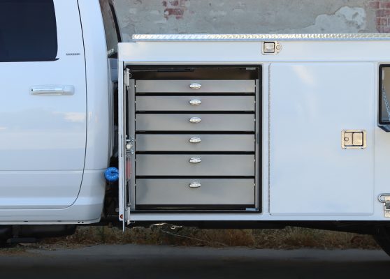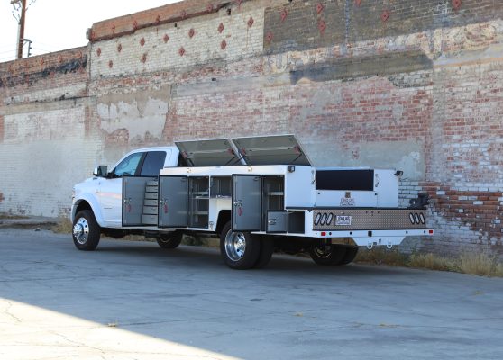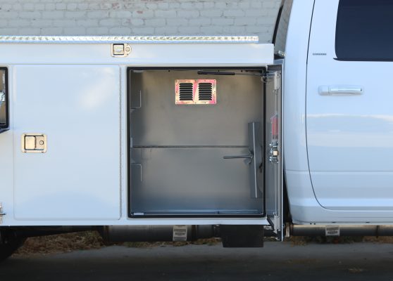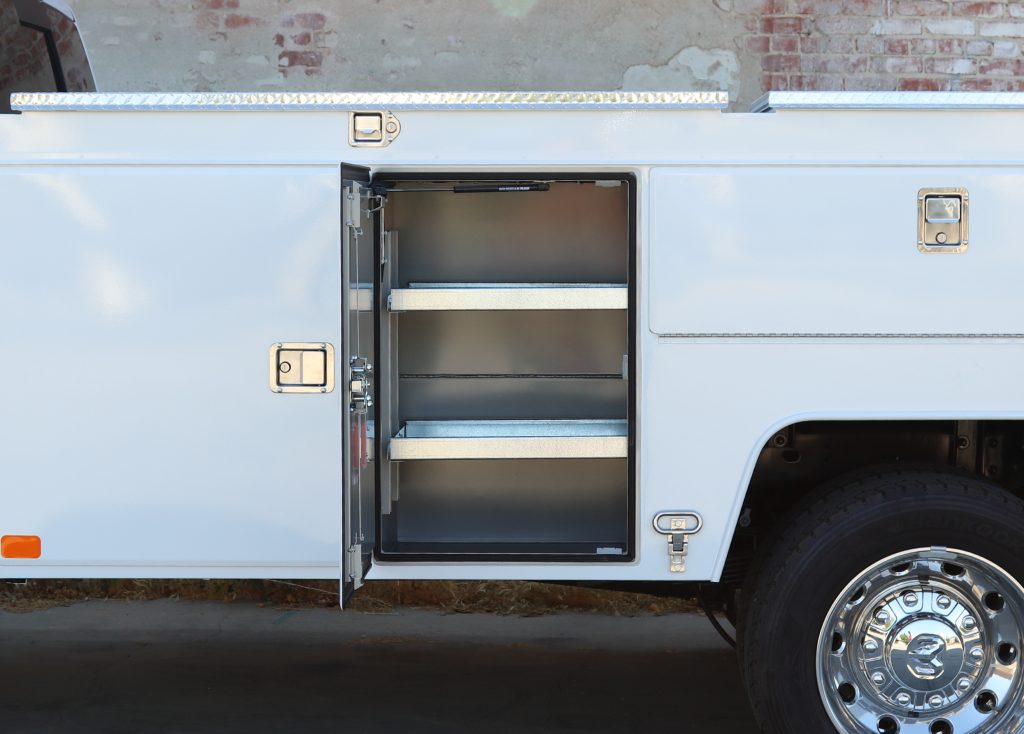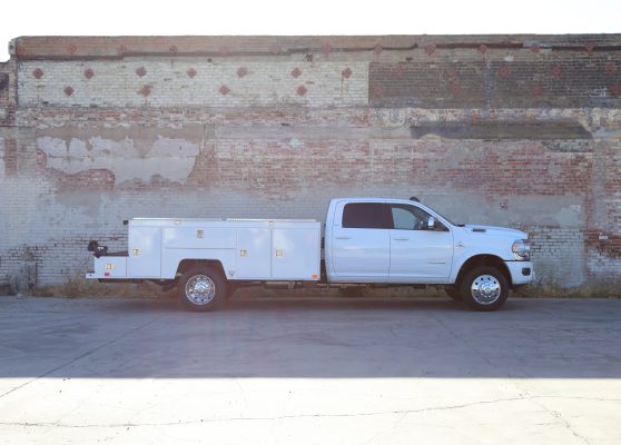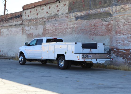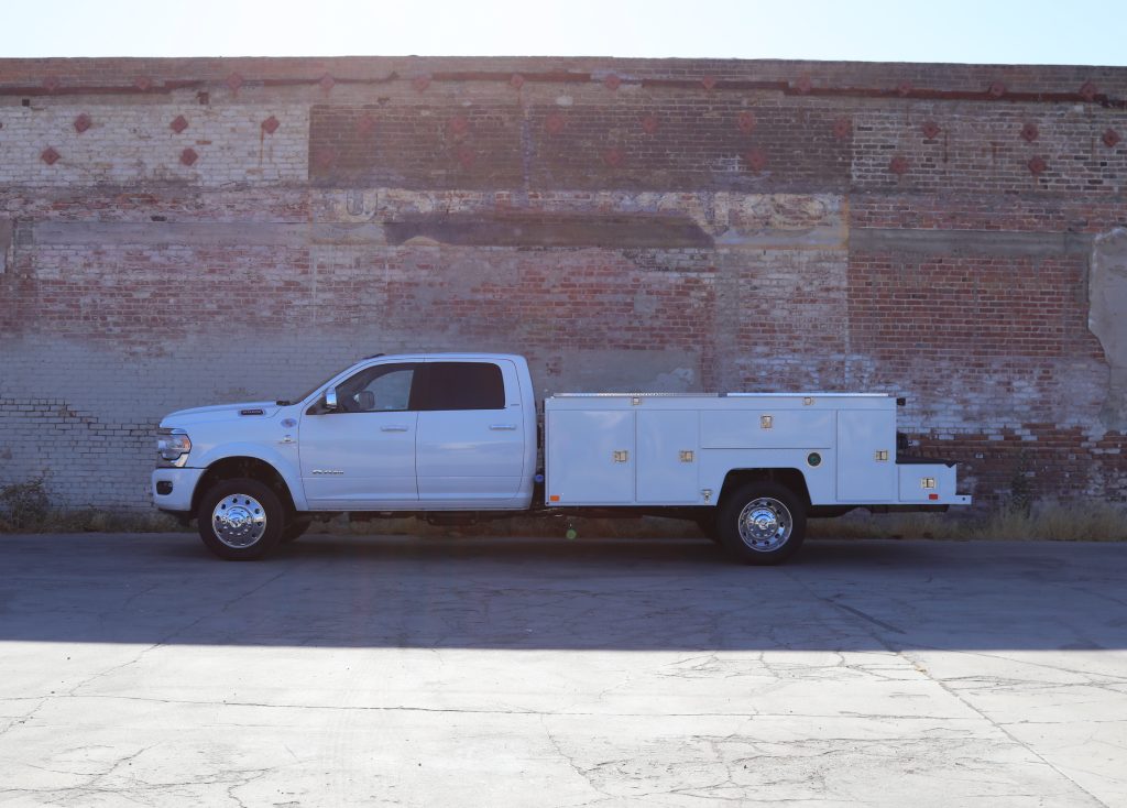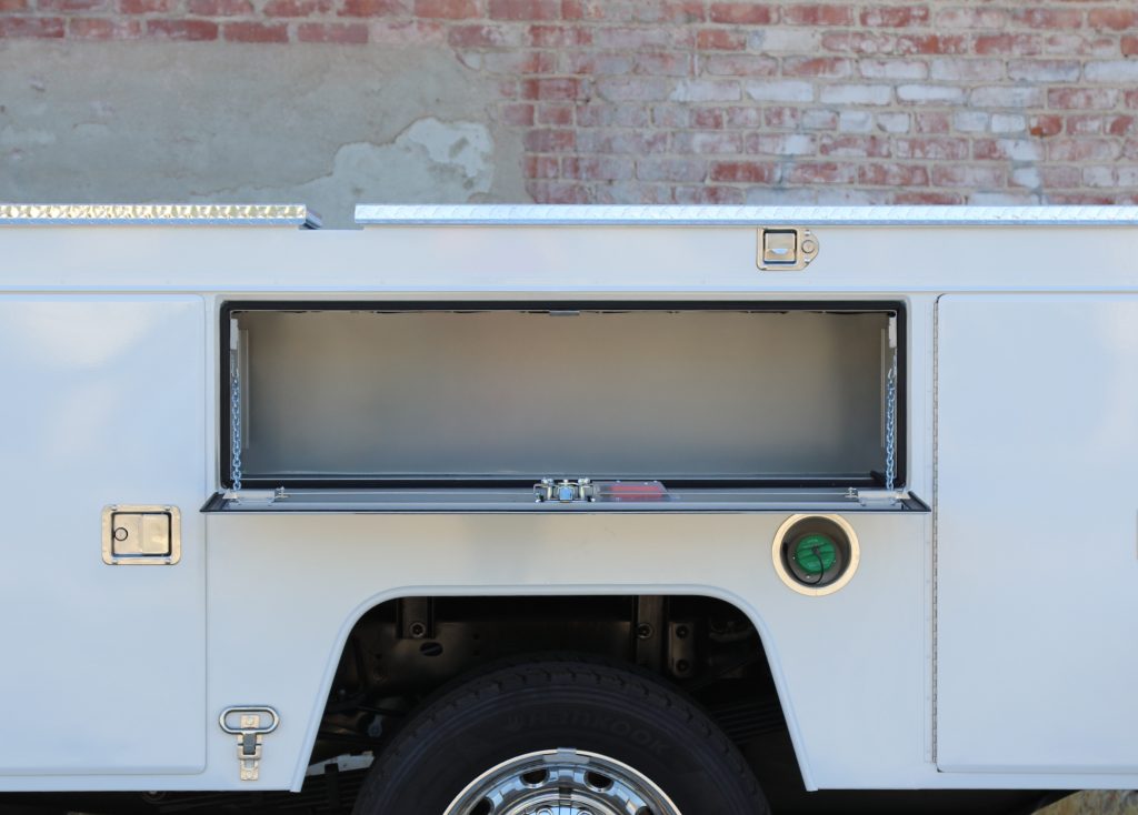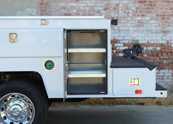 11′ Douglass Truck Body with Flip Tops built for an 84″ cab-to-axel DRW Ram 5500. This truck features adjustable shelving, mechanic’s drawers, and LED strip lighting throughout the compartments. The front curbside compartment is upfitted with hose holder and oxy/acetylene bottle clamp. The rear work platform is equipped with a customer-supplied vise, a through-compartment, and Rigid LED lights for added functionality and visibility. A pop-lock system provides convenient, centralized locking. Additional features include aluminum diamond plate overlays on the compartment tops and kick plate, along with bedliner applied to the cargo area, work platform, and bumper for added durability and protection.