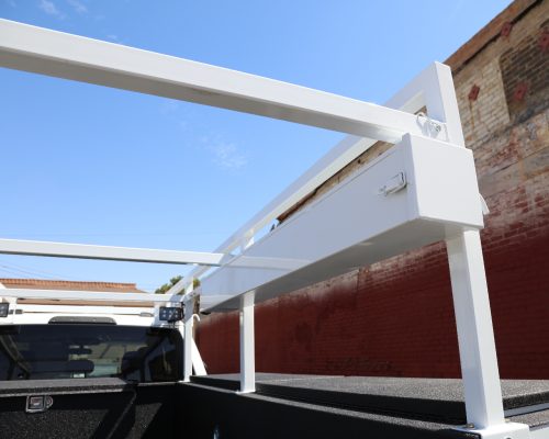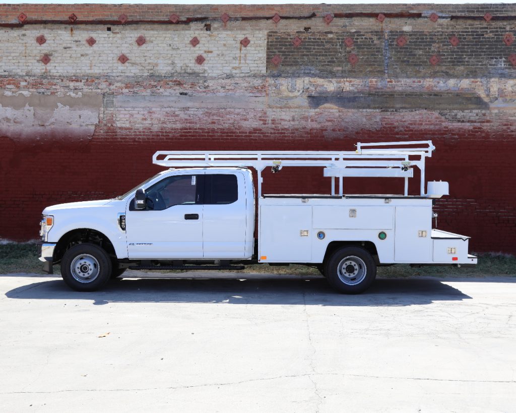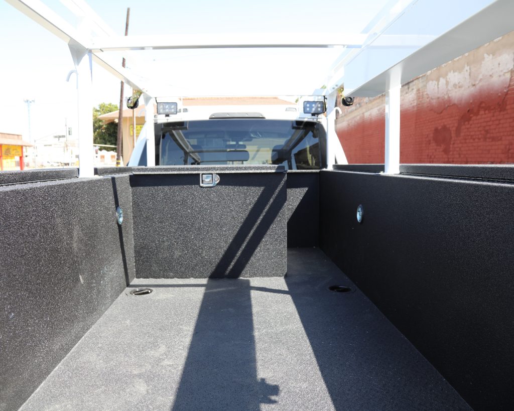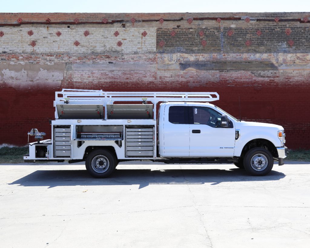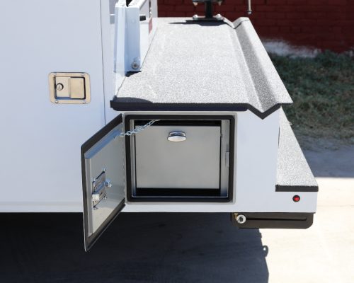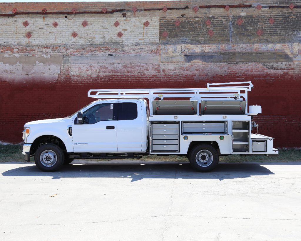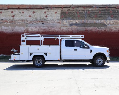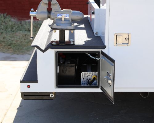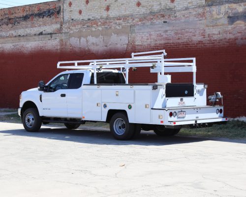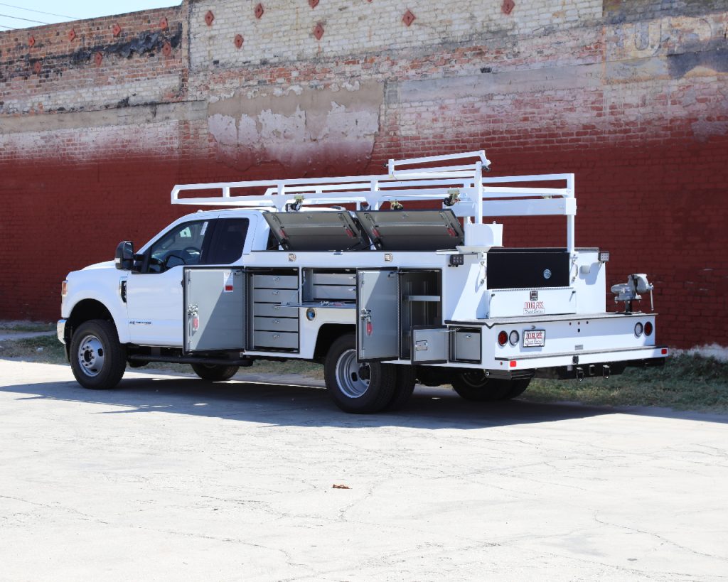 9′ Douglass Service Body with built in flip-top boxes, built for a 60″ cab-to-axle DRW Ford F350. Built with custom sized mechanics drawers and adjustable shelving mounted on rolled channel and secured with spring-nuts for easy adjustment, and interior lighting. This body also features a built-in cargo box against the headboard, mechanics drawer in the driver side work platform, and ladder rack with curb side umbrella storage box. On demand power for tools or other equipment is provided by a 3000-watt power inverter, installed in the curb side work platform compartment. Pop locks were added to all compartments for security and convenience. For body protection, it has aluminum diamond plate overlays and bed lining in the cargo area, work platform, bumper surface, and flip top lids.