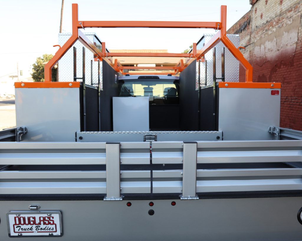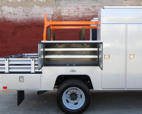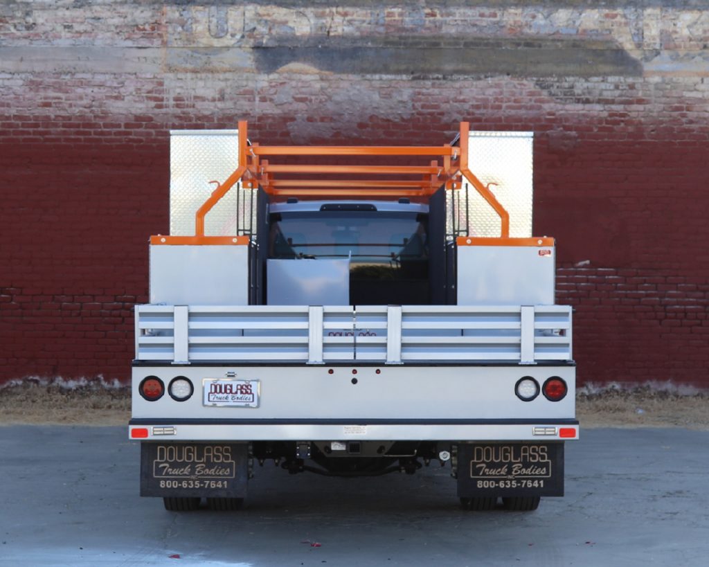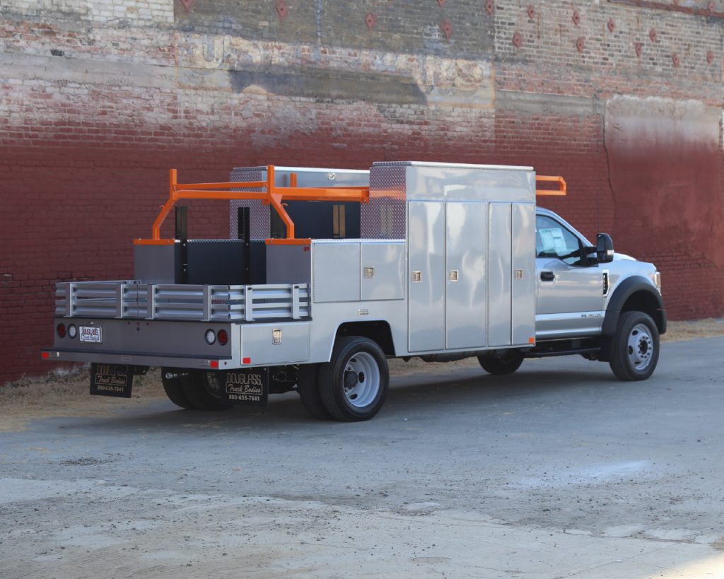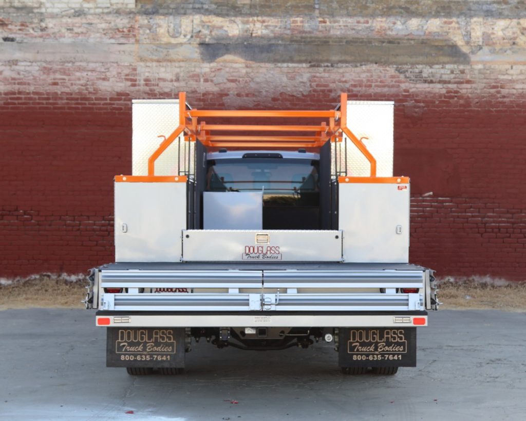 14′ Custom Douglass Truck Body with flip tops built for a 108″ cab-to-axle DRW Ford F550, engineered for heavy-duty performance and efficient jobsite organization. This build features raised front compartments with integrated flip tops, accessible directly from the cargo area, while lowered rear compartments provide convenient ground-level access. The forward driver-side compartment is outfitted with dedicated oxy/acetylene bottle holders, offering safe containment for combustible cylinders. A full-width work platform enhances accessibility and functionality at the rear of the body. A comprehensive cargo control system includes a forklift-loadable ladder rack with custom paint, hinged side rails, and integrated shovel holders, allowing tools and materials to be transported securely and efficiently. Built-in utility features include a 100-gallon wet tank paired with a 20 GPM transfer pump, supporting on-site fluid transfer needs. For added durability, aluminum diamond plate overlays protect the tops, fronts, and backs of compartments, while a durable bedliner coating applied to the cargo area and rear bumper, along with heavy-duty mud flaps, provides long-term protection in demanding work environments.