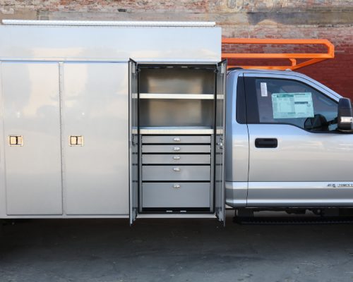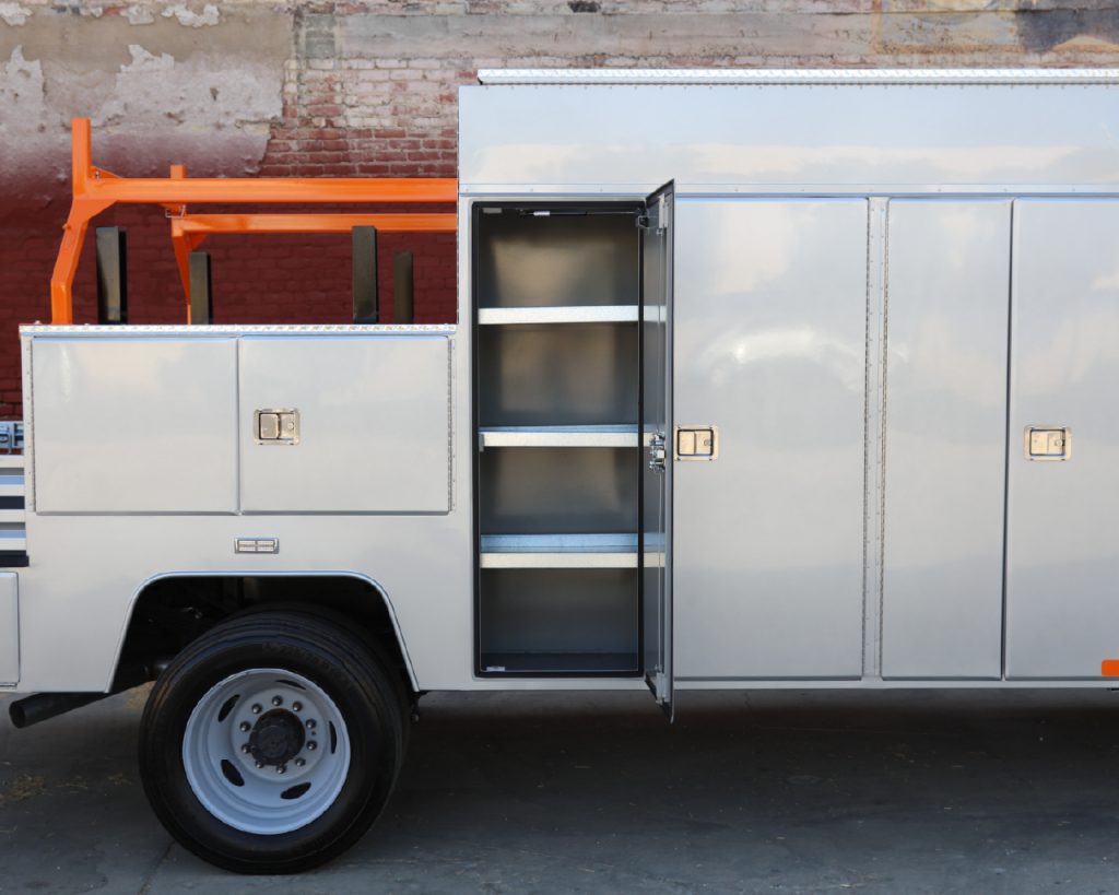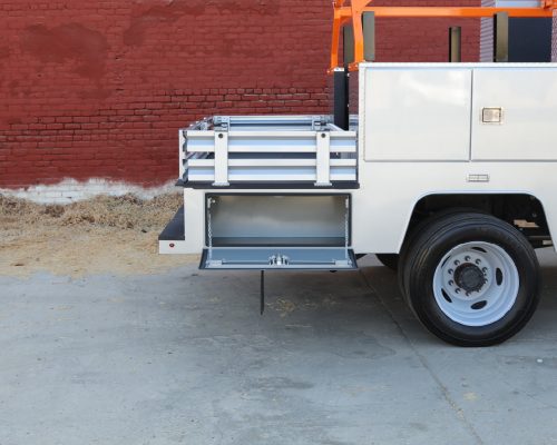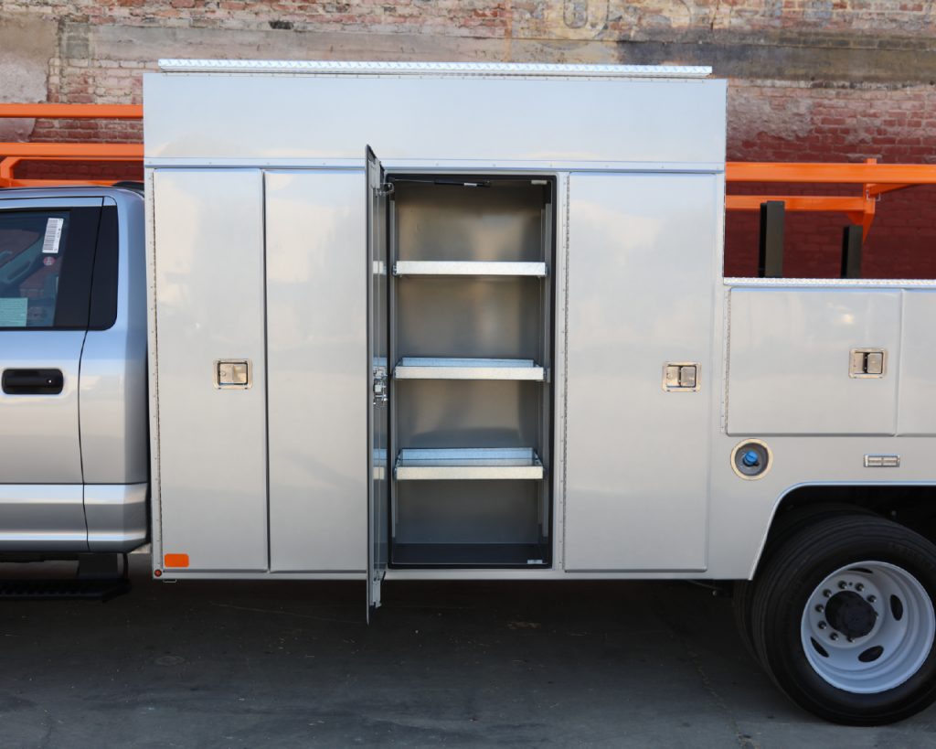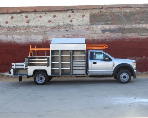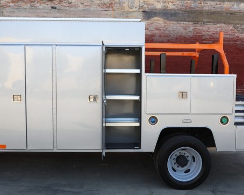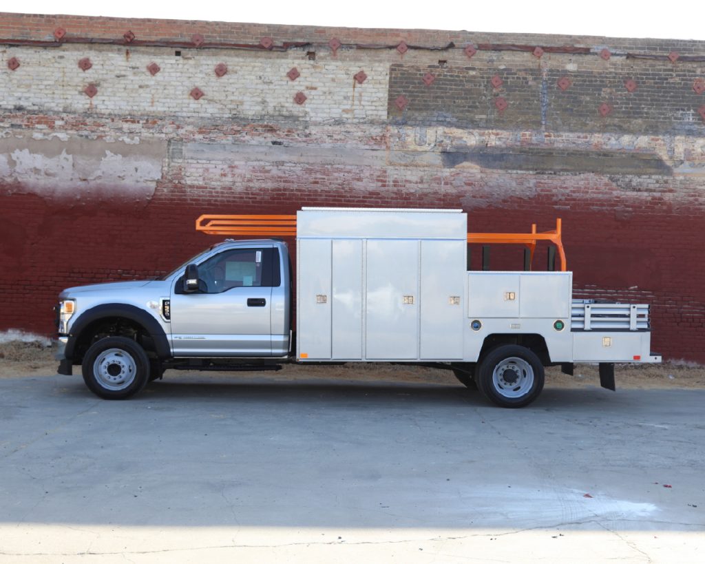 14′ Custom Douglass Truck Body with flip tops built for a 108″ cab-to-axle DRW Ford F550, engineered for heavy-duty performance and efficient jobsite organization. This build features raised front compartments with integrated flip tops, accessible directly from the cargo area, while lowered rear compartments provide convenient ground-level access. The forward driver-side compartment is outfitted with dedicated oxy/acetylene bottle holders, offering safe containment for combustible cylinders. A full-width work platform enhances accessibility and functionality at the rear of the body. A comprehensive cargo control system includes a forklift-loadable ladder rack with custom paint, hinged side rails, and integrated shovel holders, allowing tools and materials to be transported securely and efficiently. Built-in utility features include a 100-gallon wet tank paired with a 20 GPM transfer pump, supporting on-site fluid transfer needs. For added durability, aluminum diamond plate overlays protect the tops, fronts, and backs of compartments, while a durable bedliner coating applied to the cargo area and rear bumper, along with heavy-duty mud flaps, provides long-term protection in demanding work environments.