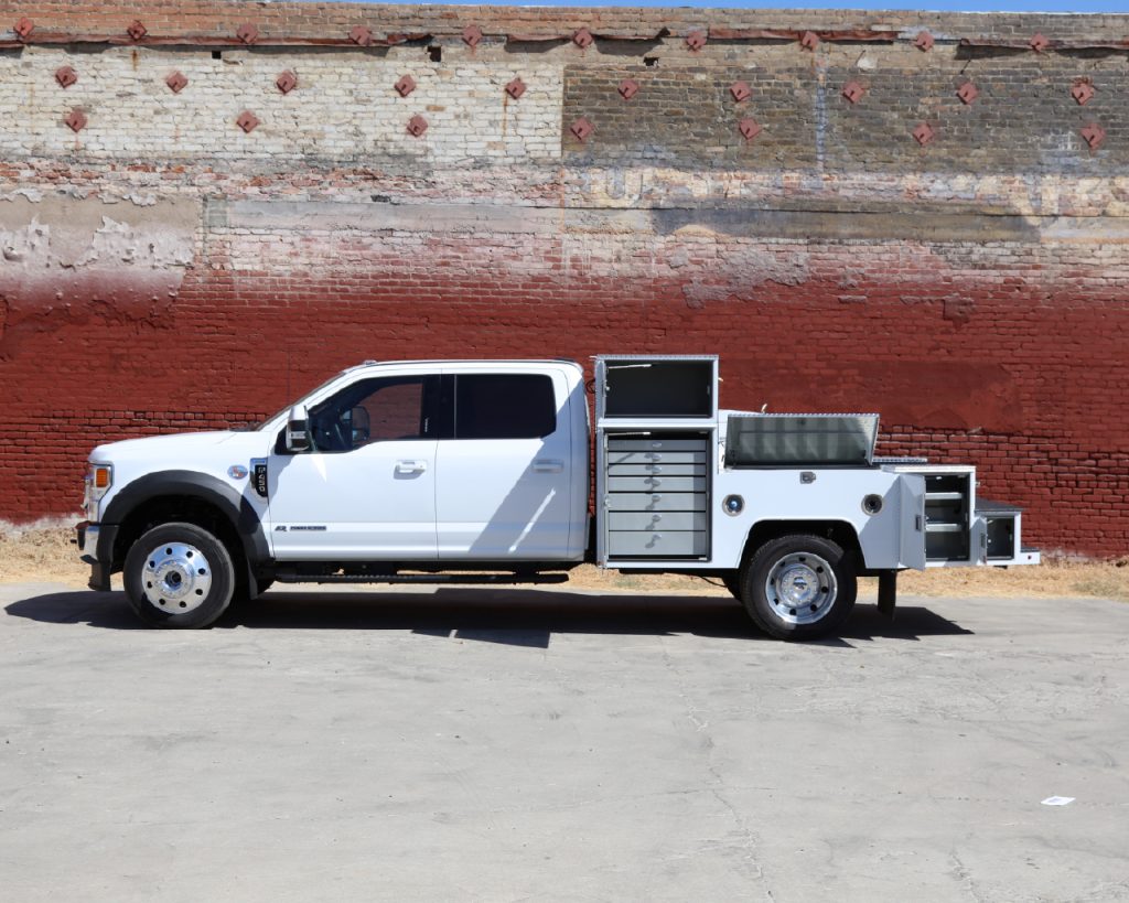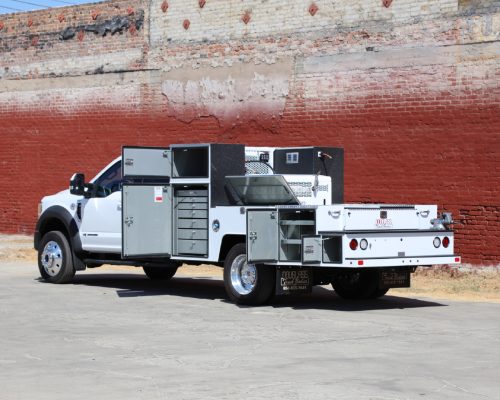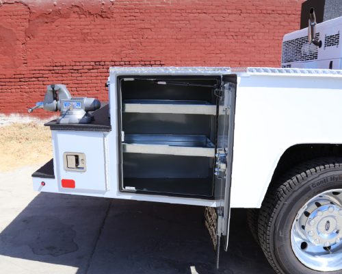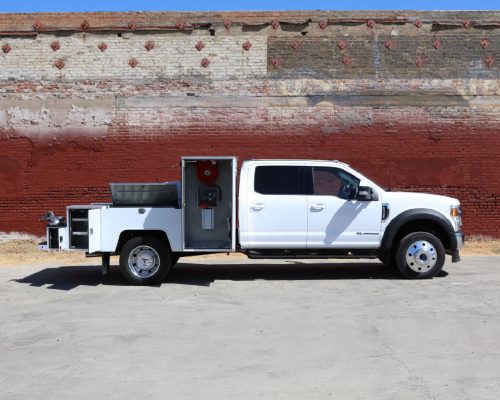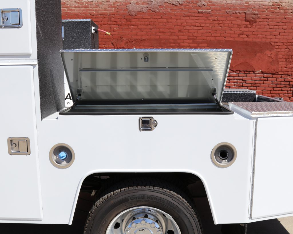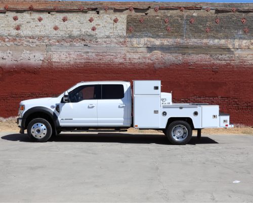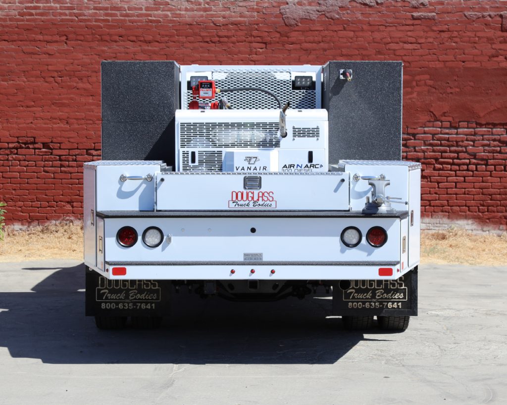 9′ Custom Douglass Hauler Body built for 60″ cab-to-axle DRW Ford F450 and designed to haul up to 30,000 lbs. The raised front compartments and built-in storage over the rear wheel wells maximize space while keeping tools organized and accessible. The body includes adjustable shelving, mechanics drawers and cab protector with work lights. A turnover ball hitch, tapered rear compartment, and low-profile work platform accommodate 5th wheels and other heavy-duty trailers. The front curbside compartment features hose holder, bottle rings and clamps, an air hose reel, and remote control panel, all plumbed to the cargo-area-installed Vanair Air-N-Arc 300 All-In-One. Additional equipment includes a 100-gallon wet tank and Fillrite 15 GPM Transfer Pump for off-road or emergency fuel refills. For protection, bedliner is applied to the backs of the raised compartments, cargo area, platform, and bumper, and the build is finished with diamond plate overlays, rock splash guards, and mud flaps.