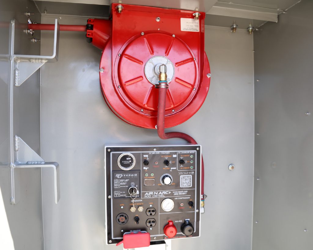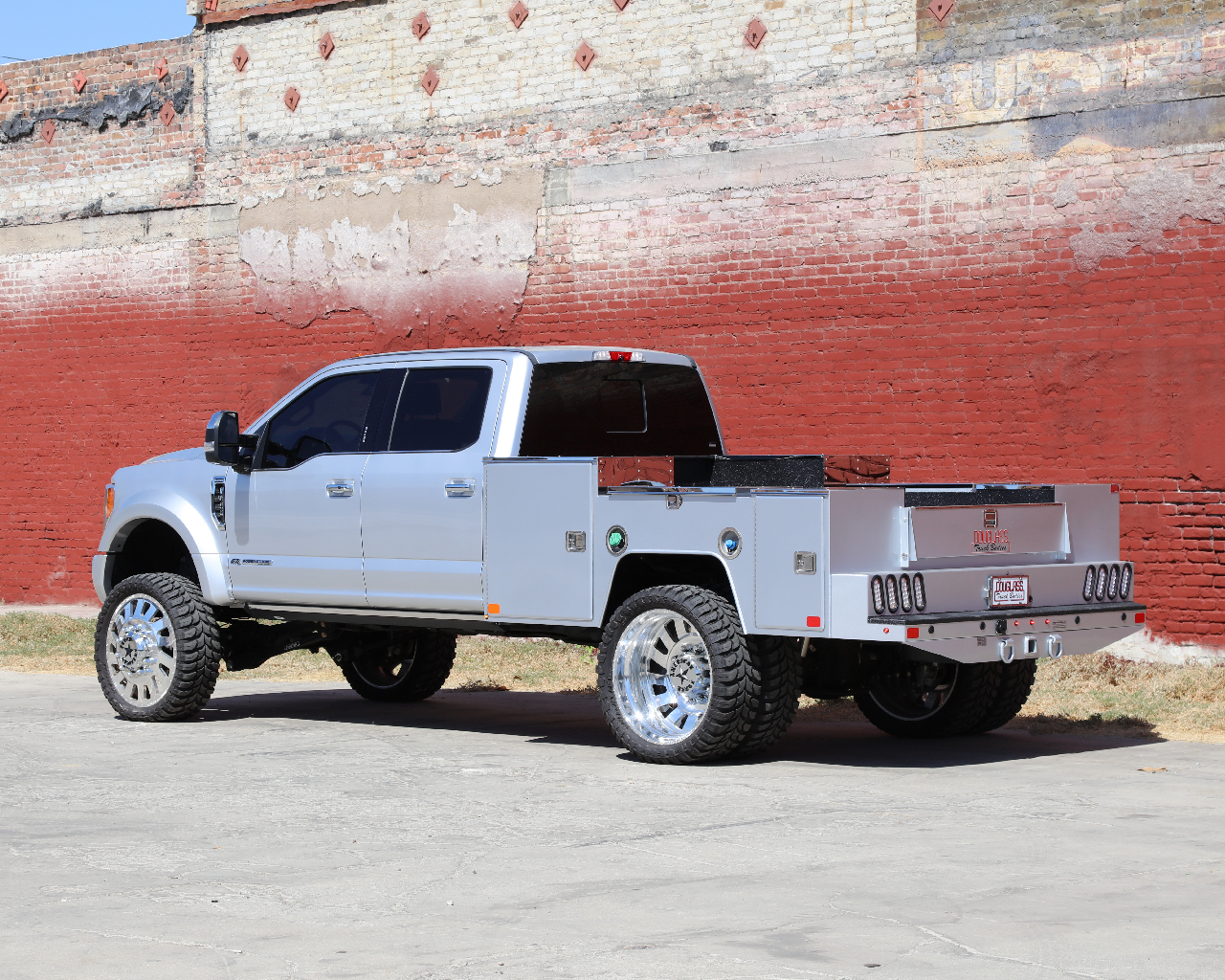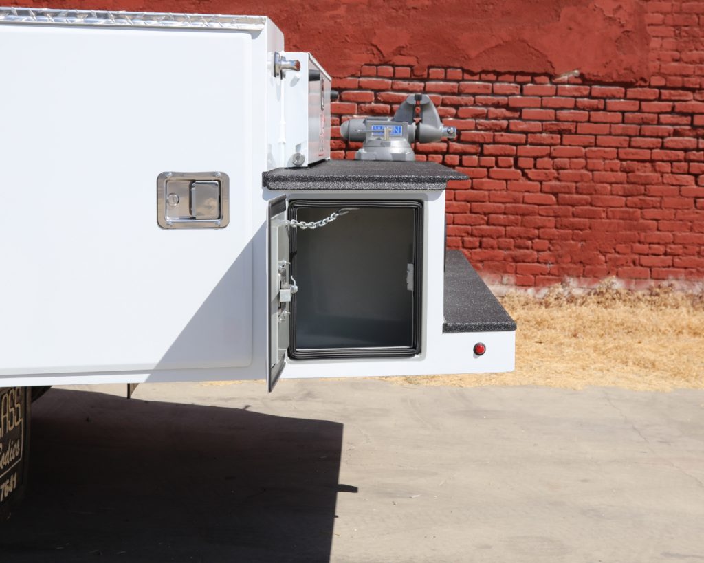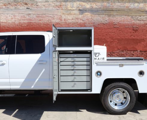 9′ Custom Douglass Hauler Body built for 60″ cab-to-axle DRW Ford F450 and designed to haul up to 30,000 lbs. The raised front compartments and built-in storage over the rear wheel wells maximize space while keeping tools organized and accessible. The body includes adjustable shelving, mechanics drawers and cab protector with work lights. A turnover ball hitch, tapered rear compartment, and low-profile work platform accommodate 5th wheels and other heavy-duty trailers. The front curbside compartment features hose holder, bottle rings and clamps, an air hose reel, and remote control panel, all plumbed to the cargo-area-installed Vanair Air-N-Arc 300 All-In-One. Additional equipment includes a 100-gallon wet tank and Fillrite 15 GPM Transfer Pump for off-road or emergency fuel refills. For protection, bedliner is applied to the backs of the raised compartments, cargo area, platform, and bumper, and the build is finished with diamond plate overlays, rock splash guards, and mud flaps.