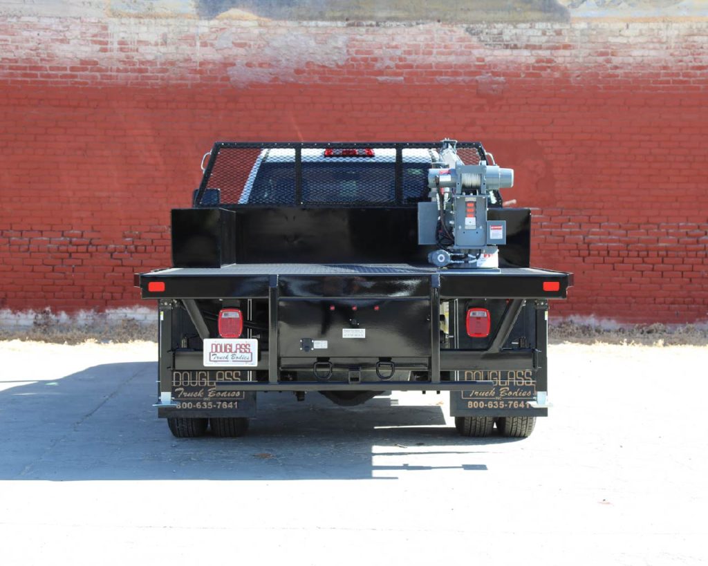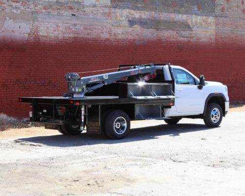 12′ Douglass Flatbed built for an 84″ cab-to-axle DRW GMC 3500, designed for strength and efficiency on the job. Outfitted with a Venturo crane with corded remote and 4,000 lb capacity, along with manual outriggers for added stability. Flat bar tie-downs line the sides for secure cargo management, while grab handles on the tapered headboard and fold-down steps provide easy access to the bed. Topside and underbody toolboxes offer convenient storage for essential equipment. Federal Signal Universal flashers integrated into headlights and taillights enhance visibility in low light conditions.