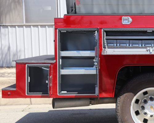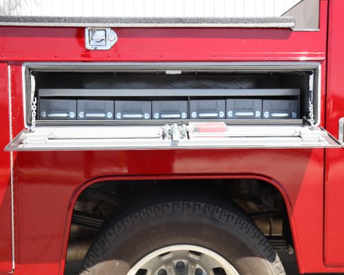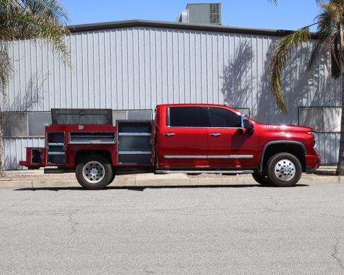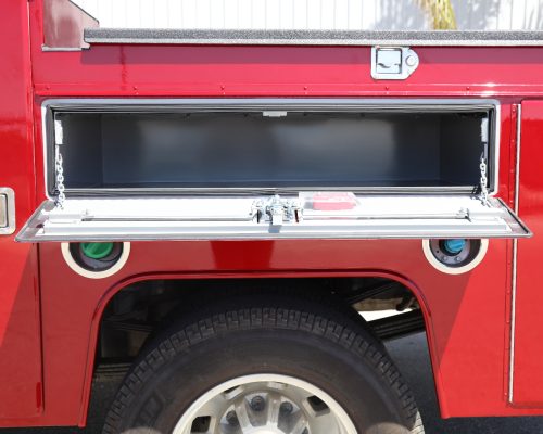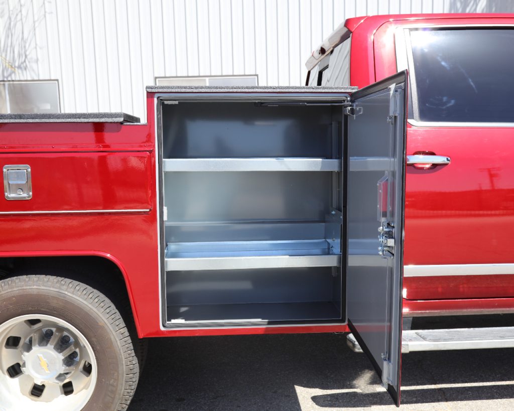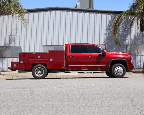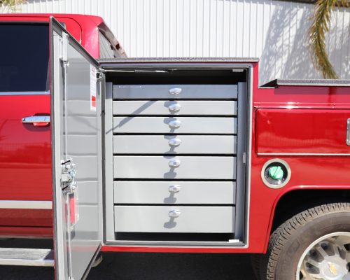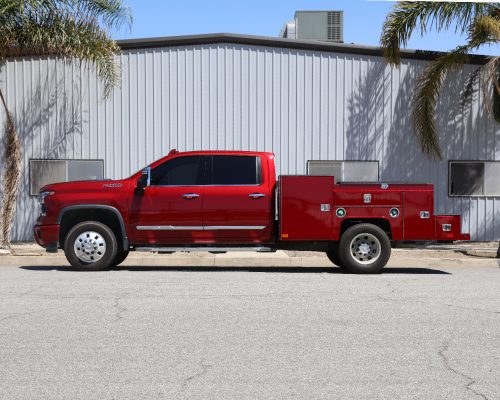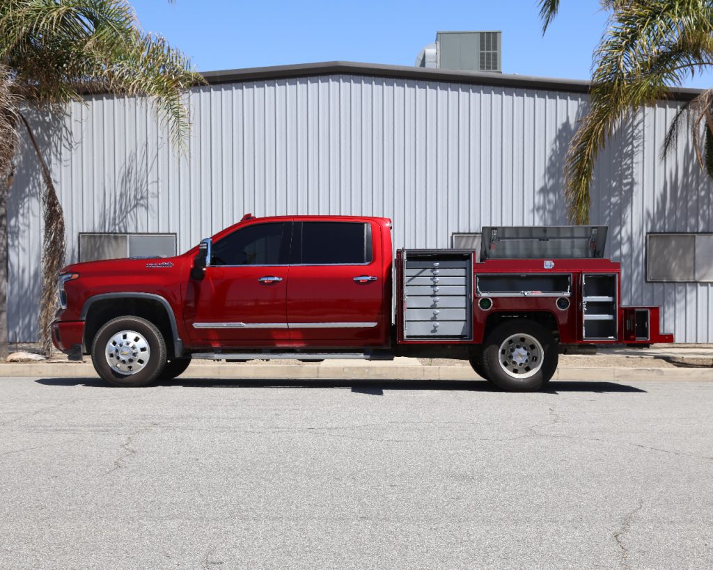 8′ Douglass Service Body with built in flip-top boxes, built for a 55.5″ cab-to-axle DRW Chevy 3500. This truck features mechanic tool drawers, adjustable shelving, and a B&W turnover ball hitch in its cargo bed. For body protection, it has spray on bed lining in the cargo area and on the compartment tops.