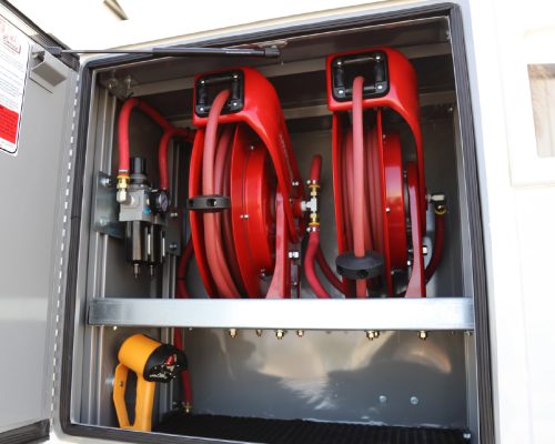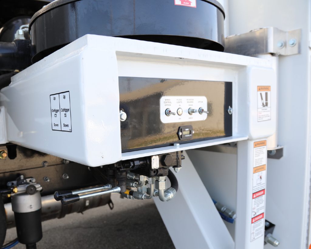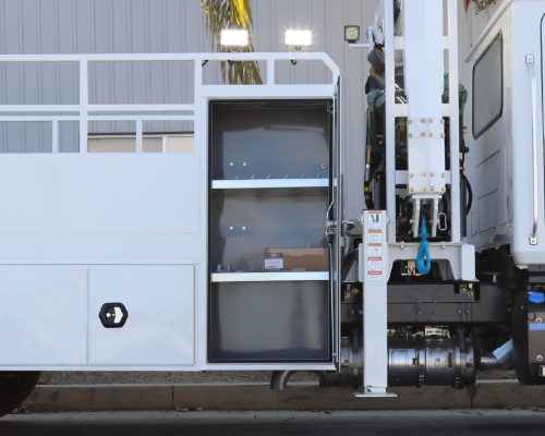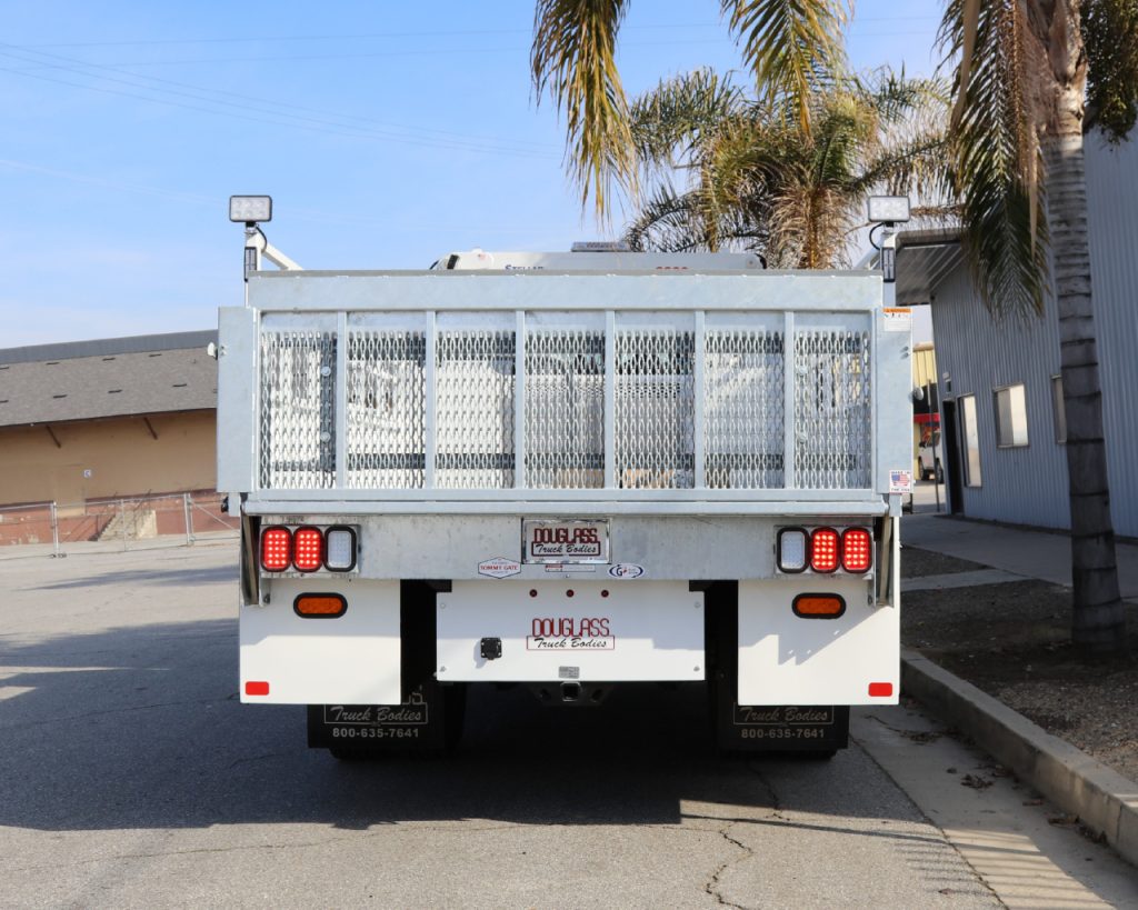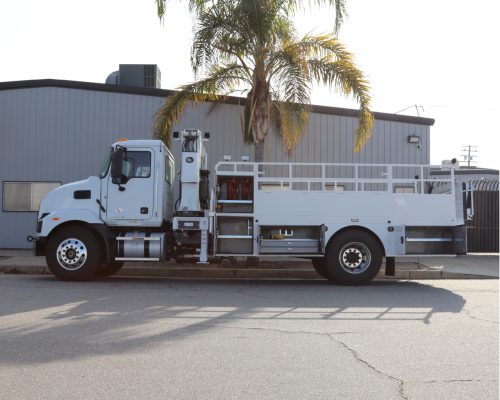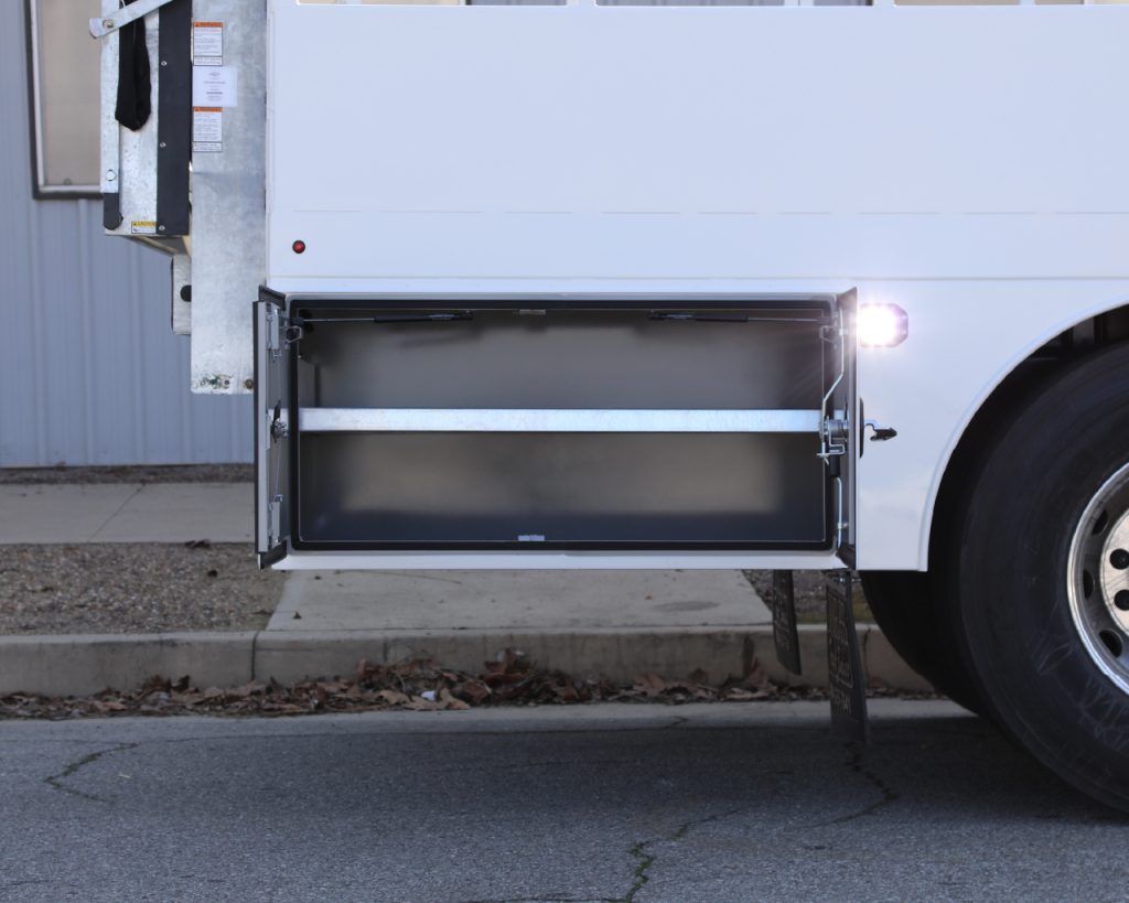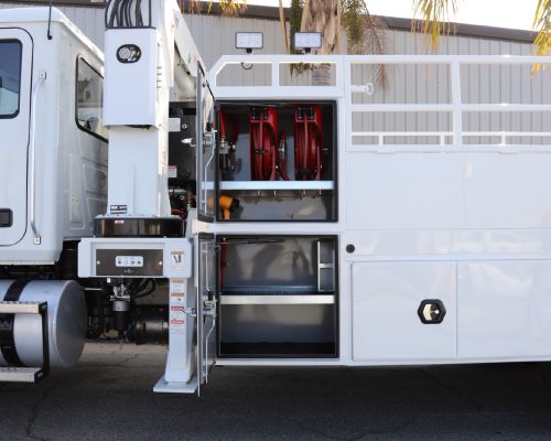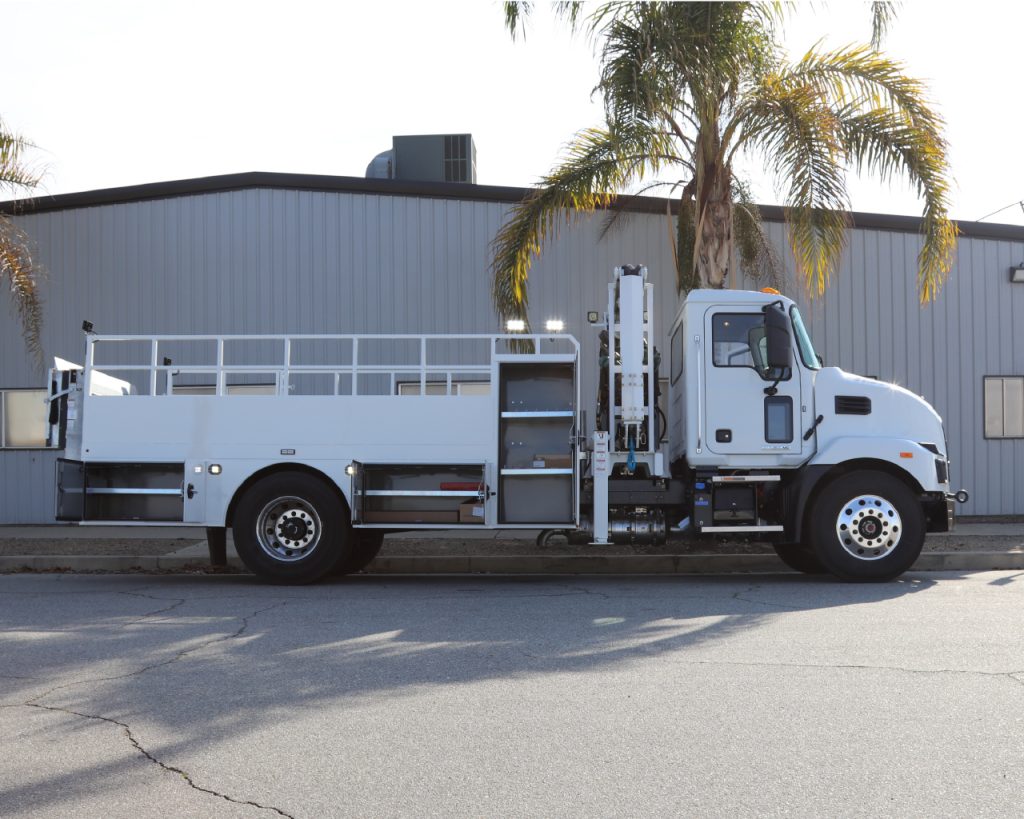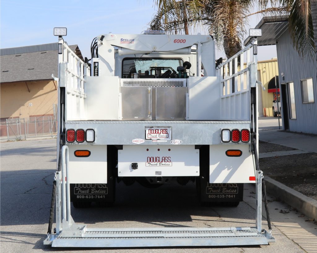 15′ Douglass Flatbed built for a 143″ cab-to-axle Mack T280 truck. This heavy-duty flatbed is equipped with a Stellar 6000 side-mount crane with fully hydraulic outriggers for reliable lifting and stability. Additional features include a galvanized Tommy liftgate, air ready system, 3kW power inverter system, and a full interior and exterior lighting package. Easily accessible compartments feature compression latches, adjustable shelving, and mechanic’s drawers, along with Dri-Dek tiles that cushion tools while allowing airflow so moisture can evaporate and equipment dries more quickly. Integrated wheel wells provide a clean, built-in appearance, while a hinged driver-side panel allows convenient access to the cargo area. Power outlets in the first driver-side compartment provide quick access to the power inverter. The cargo area is finished with a durable bedliner for long-term protection, and heavy-duty mudflaps provide long-term durability in demanding work environments.