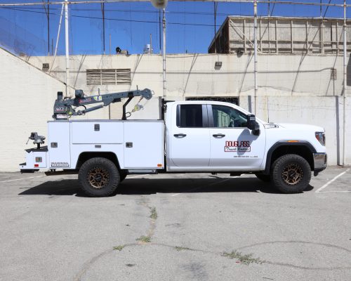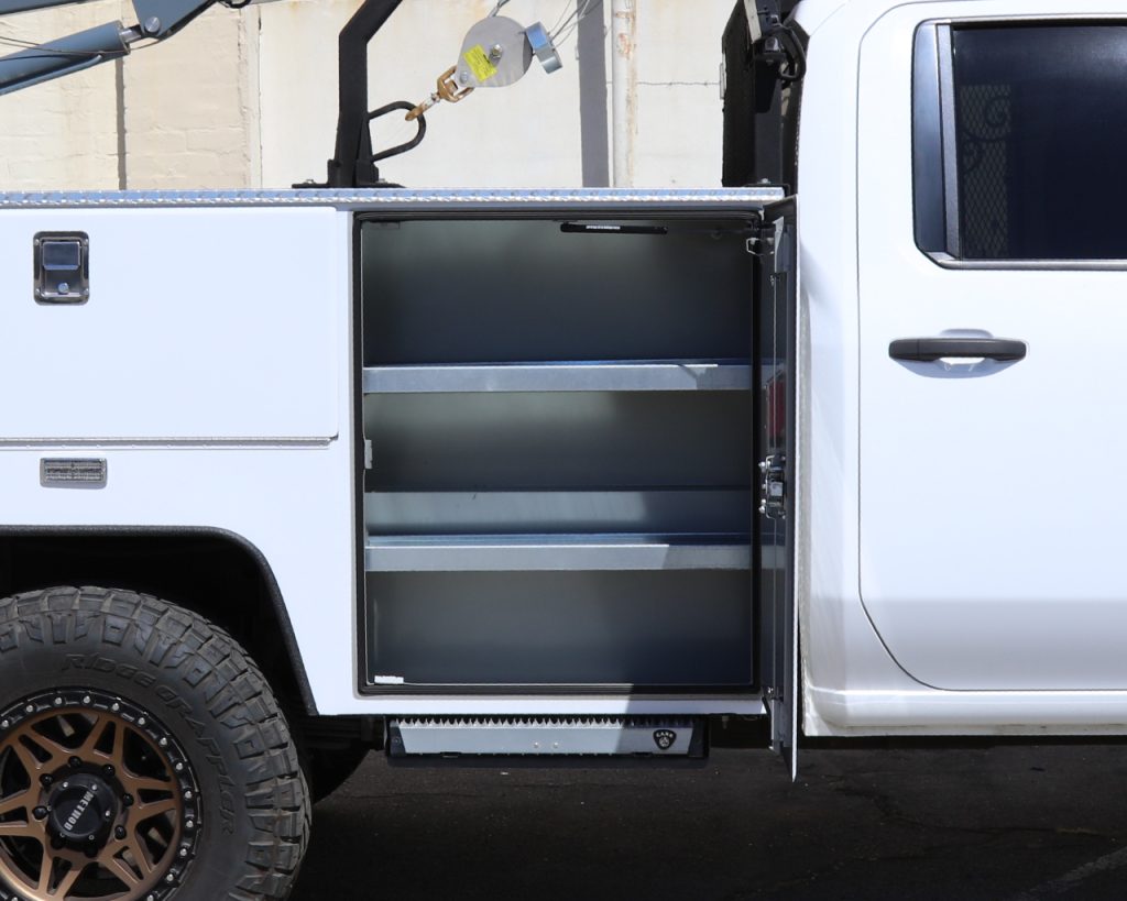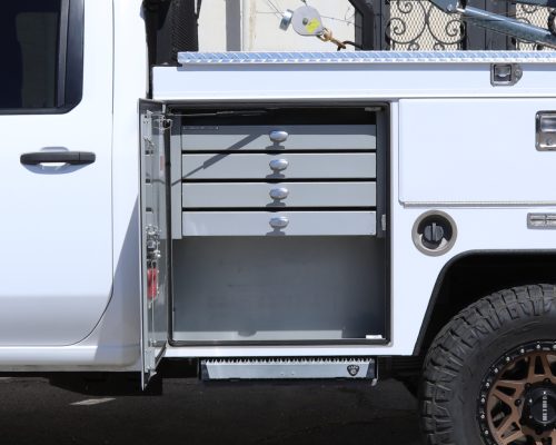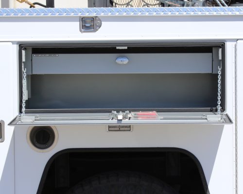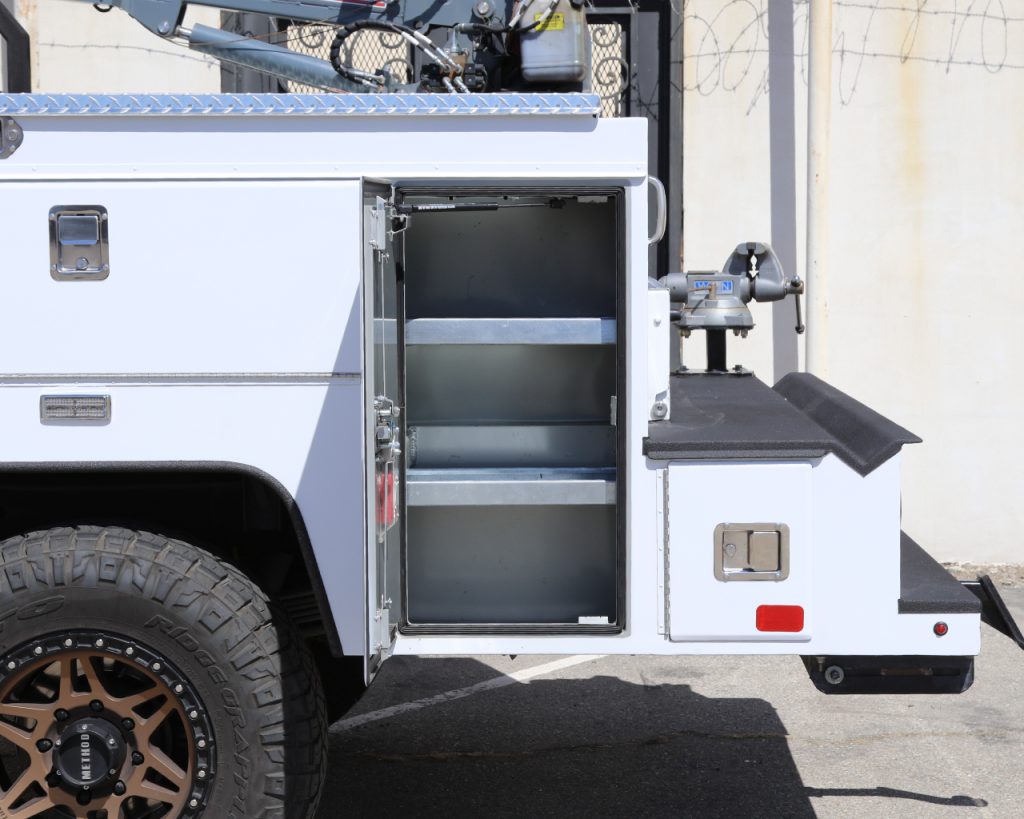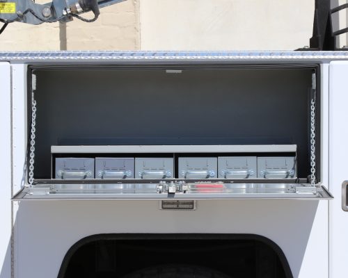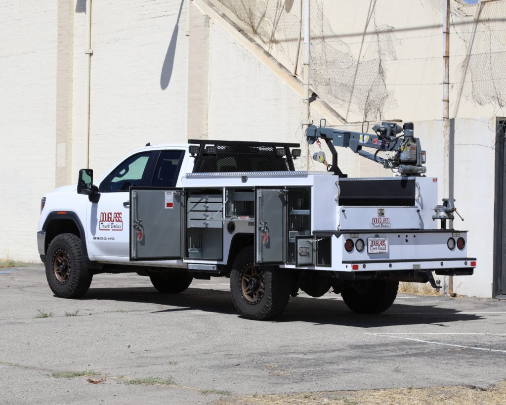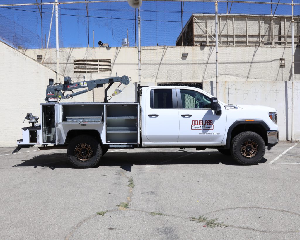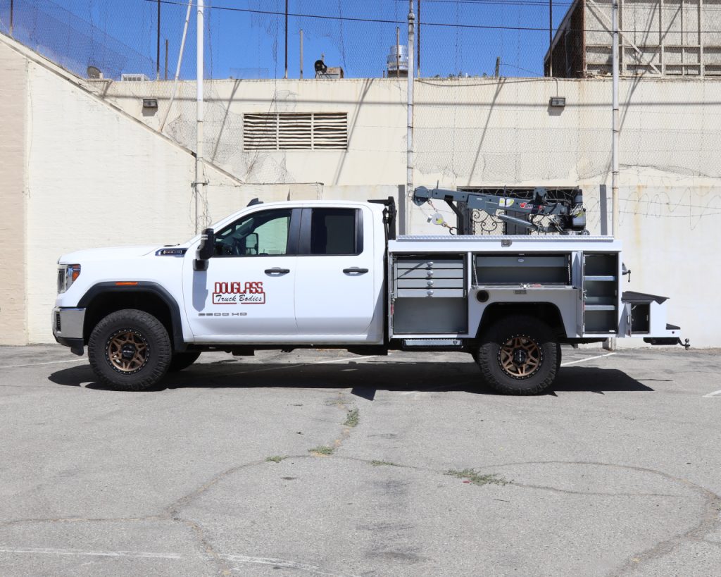8′ Douglass Maximizer Crane Body built for 56″ cab-to-axle SRW GMC 2500. The body is equipped with a Venturo ET6K crane. This truck features adjustable shelving, mechanic tool drawers, equipto bins, and a cab protector with work lights. For body protection, it has aluminum diamond plate overlay and bed lining on its cargo bed, work platform, and bumper.