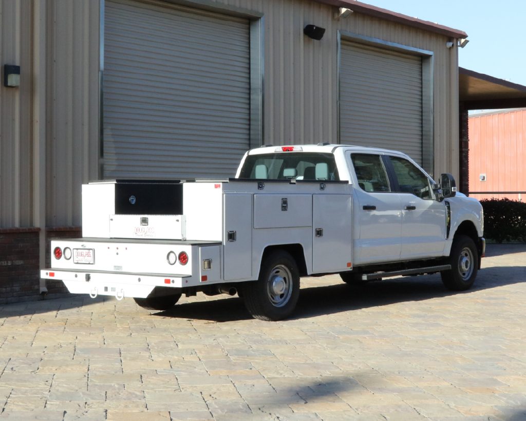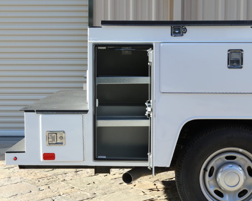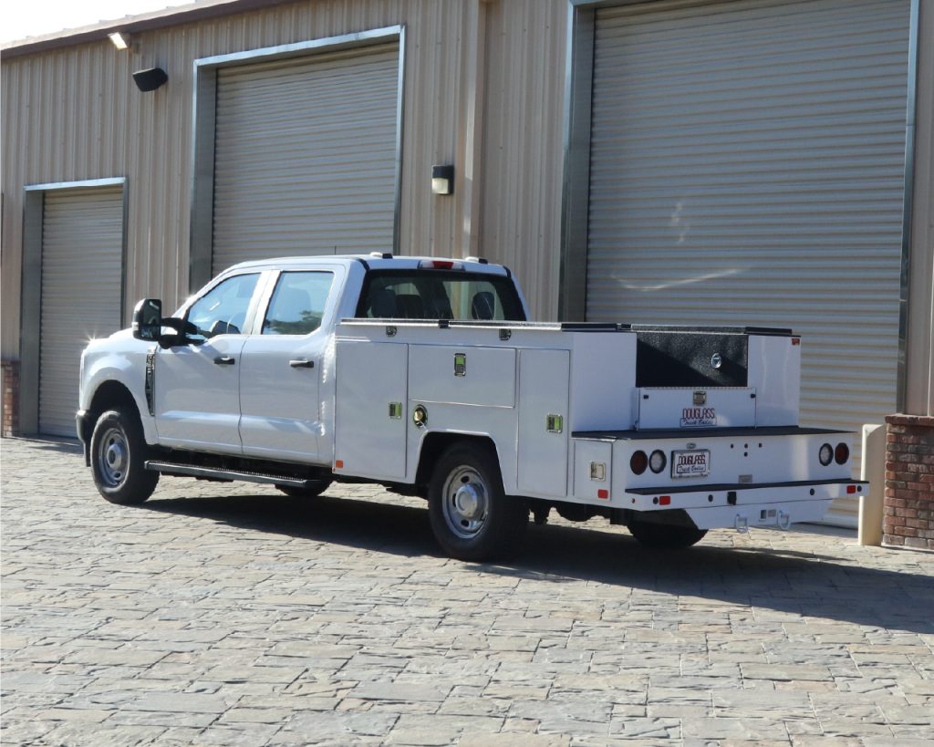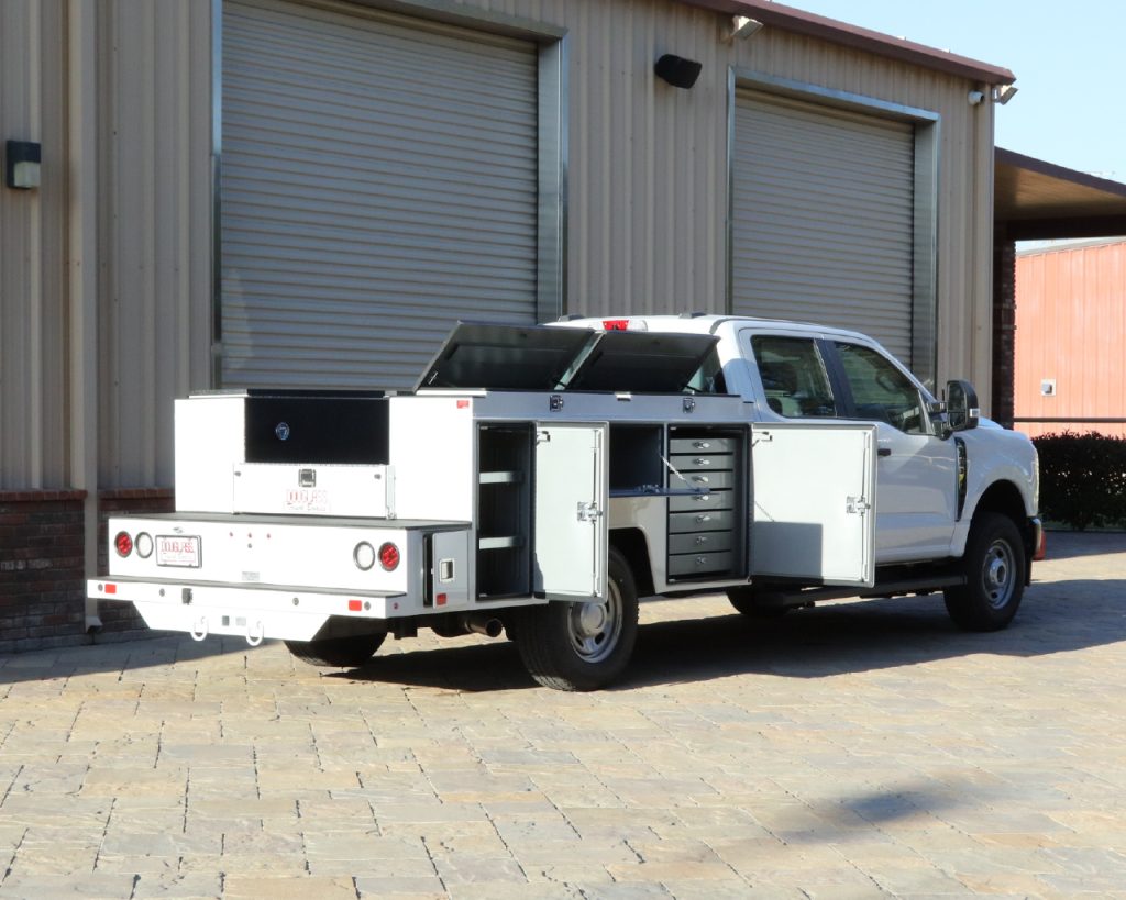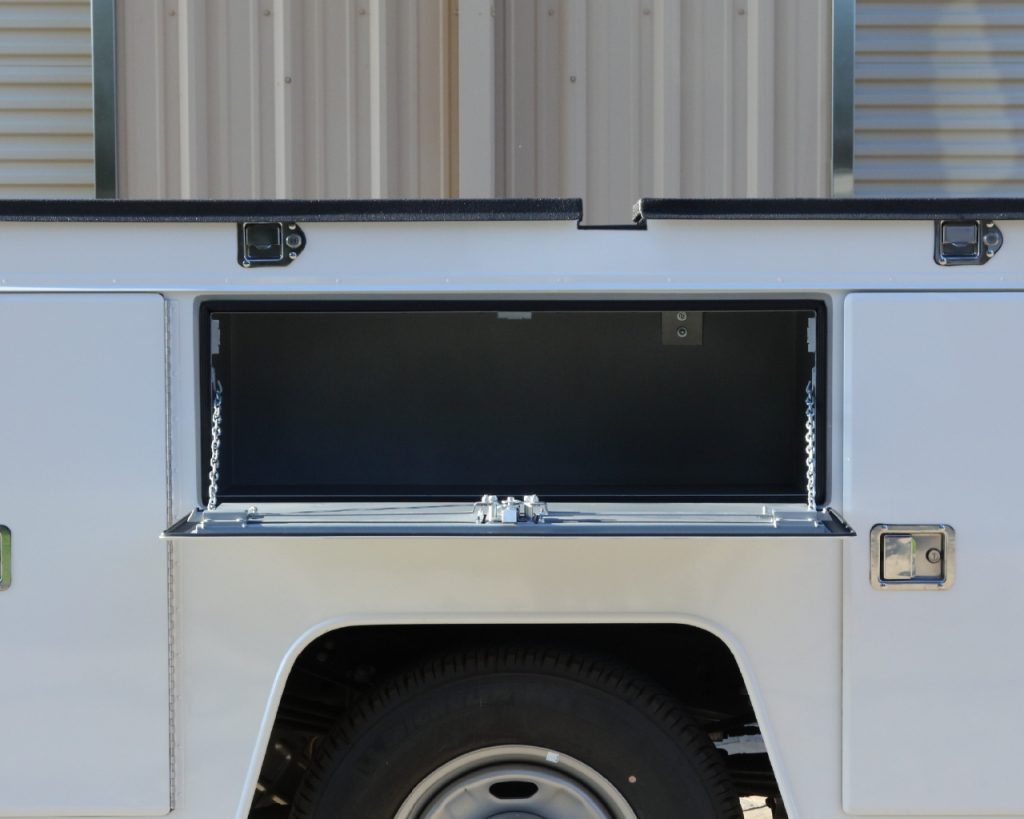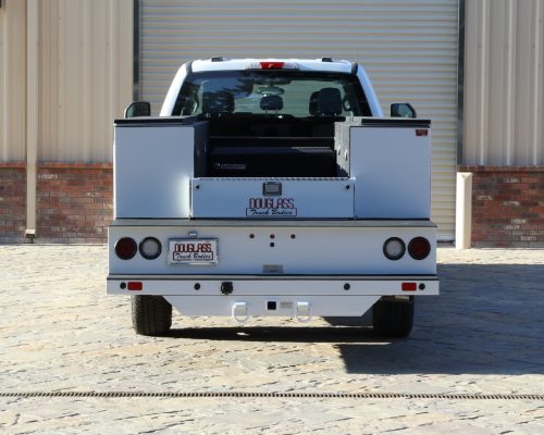 8′ Custom Douglass Service Body with Flip-tops built for a 56″ cab-to-axle SRW Ford F350 XL. This build features adjustable shelving and mechanics drawers inside the compartments along with built in flip-top bins that include removeable dividers for easy and convenient organization. Rugged Luverne running boards were placed on both sides of the cab to make climbing inside easy and safe. The rear end has a work platform and pass-through compartment to store and secure longer items, and an aluminum Weather Guard box is installed at the headboard for extra storage of tools and equipment. For body protection, durable liner was applied to the cargo area, compartment tops, platform, and bumper, and aluminum diamond plating is attached to the front panels.