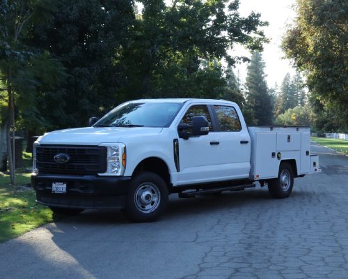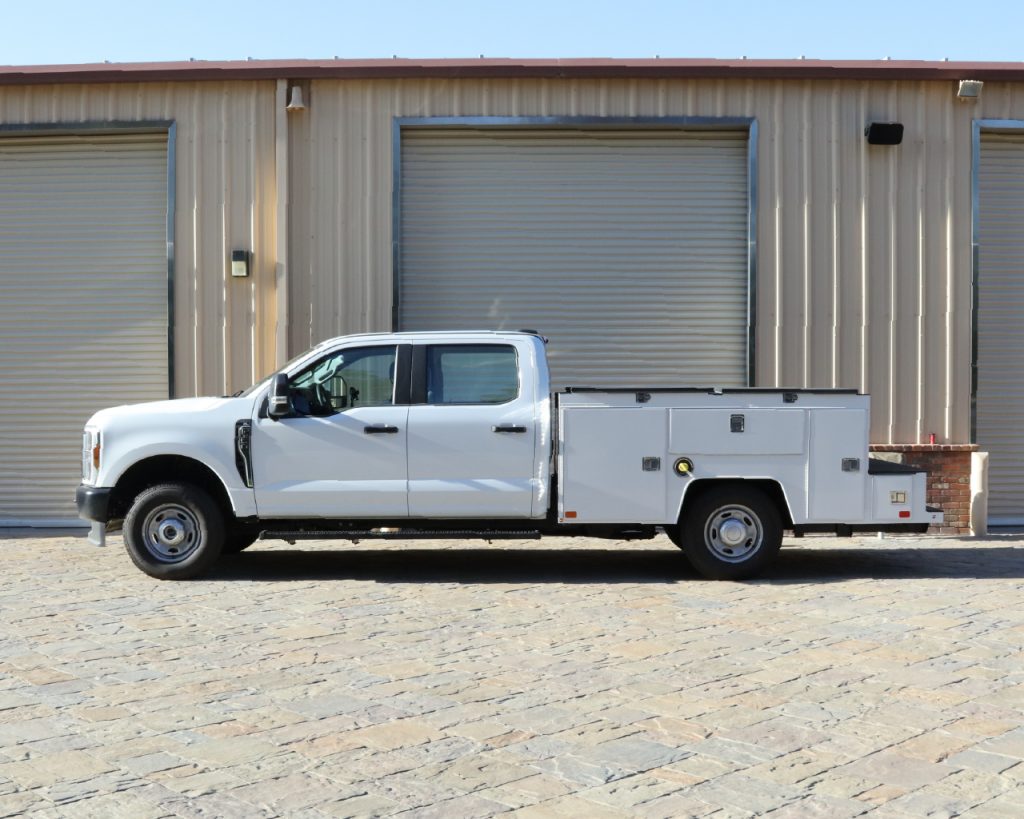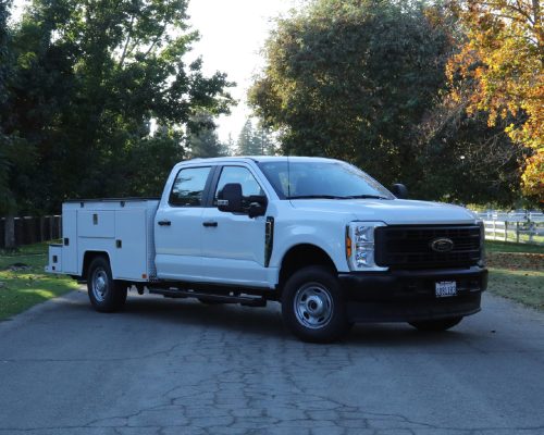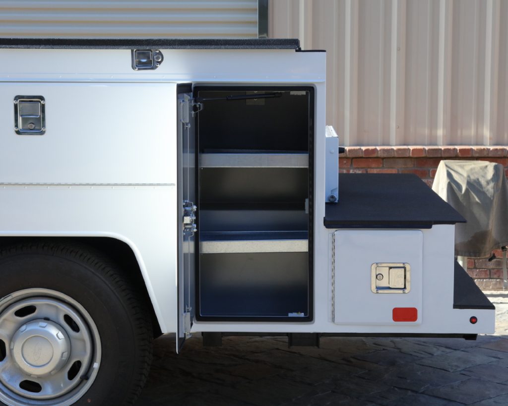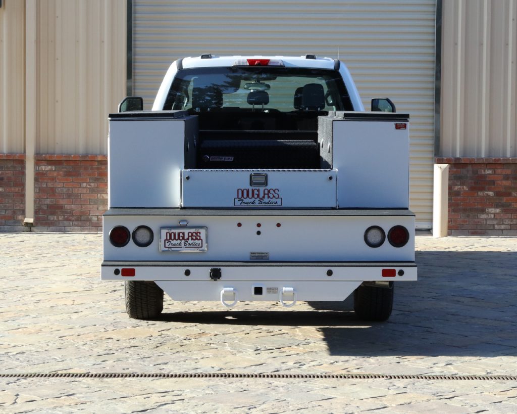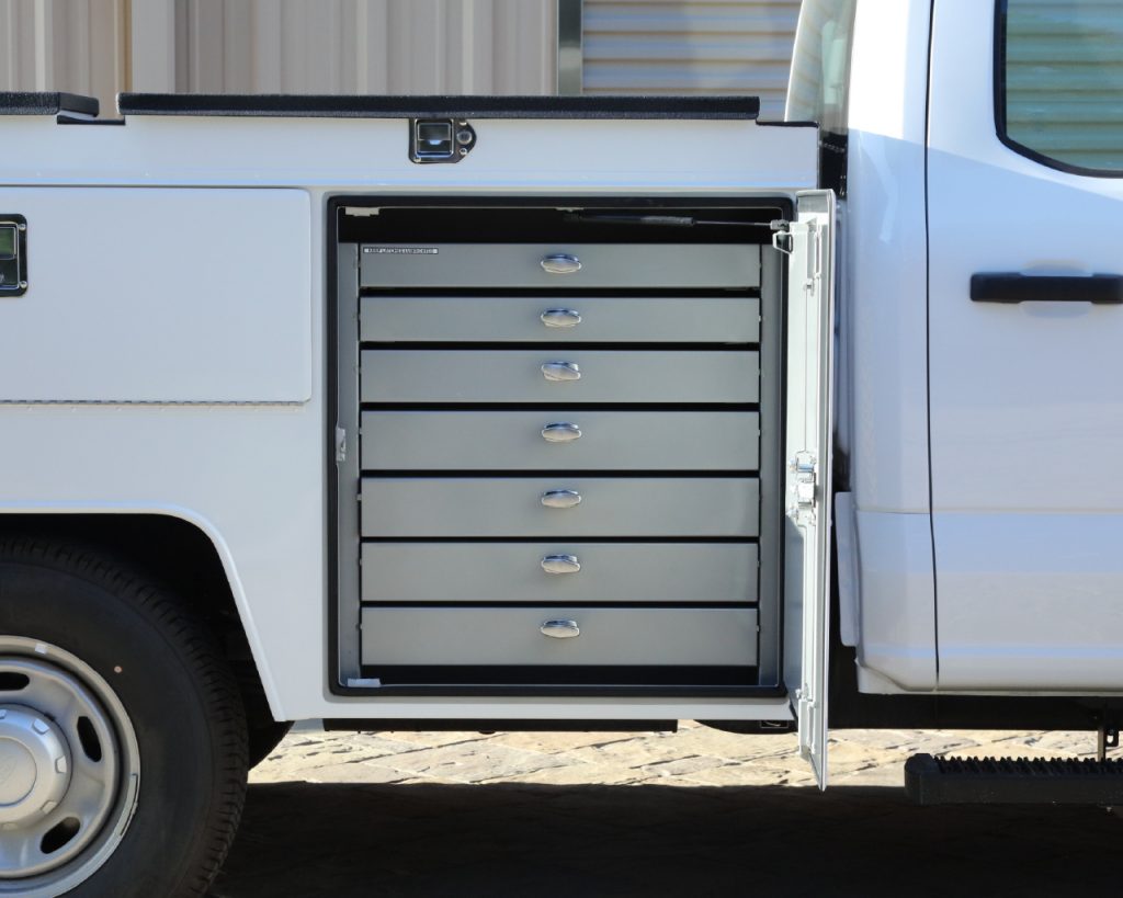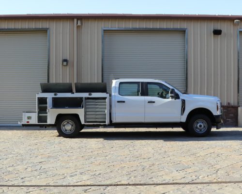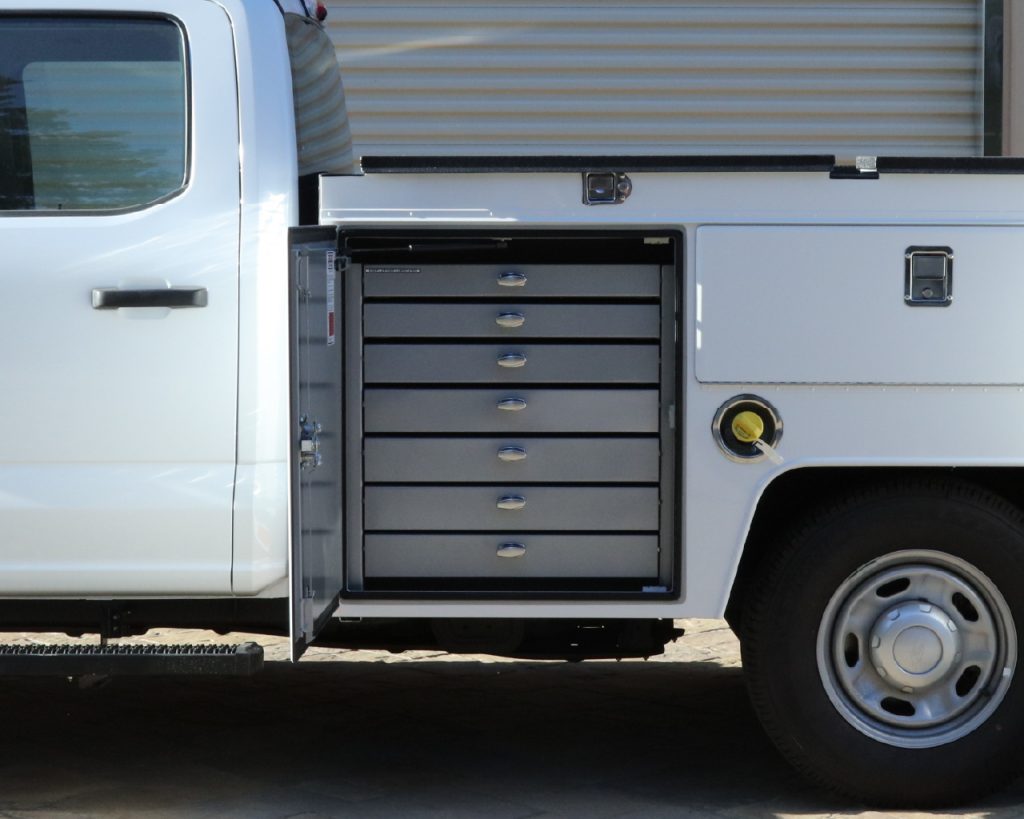 8′ Custom Douglass Service Body with Flip-tops built for a 56″ cab-to-axle SRW Ford F350 XL. This build features adjustable shelving and mechanics drawers inside the compartments along with built in flip-top bins that include removeable dividers for easy and convenient organization. Rugged Luverne running boards were placed on both sides of the cab to make climbing inside easy and safe. The rear end has a work platform and pass-through compartment to store and secure longer items, and an aluminum Weather Guard box is installed at the headboard for extra storage of tools and equipment. For body protection, durable liner was applied to the cargo area, compartment tops, platform, and bumper, and aluminum diamond plating is attached to the front panels.