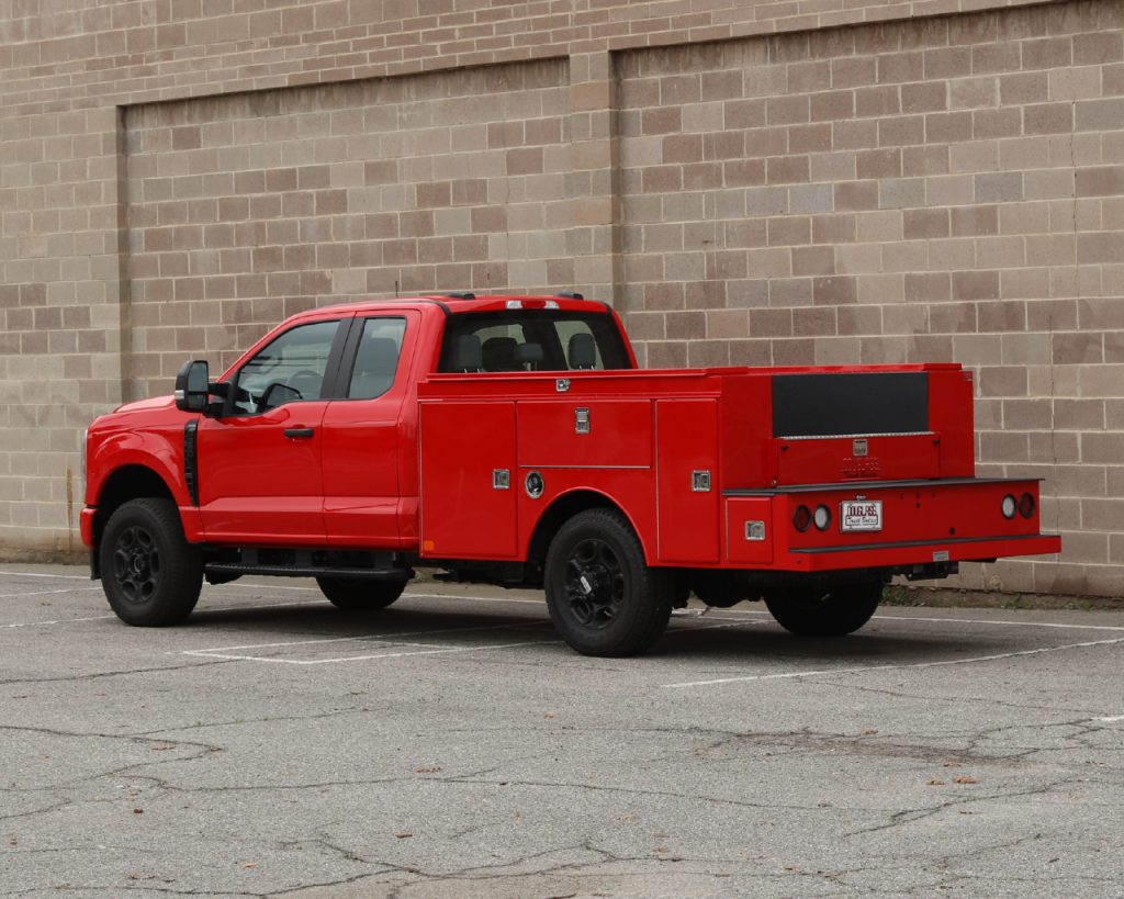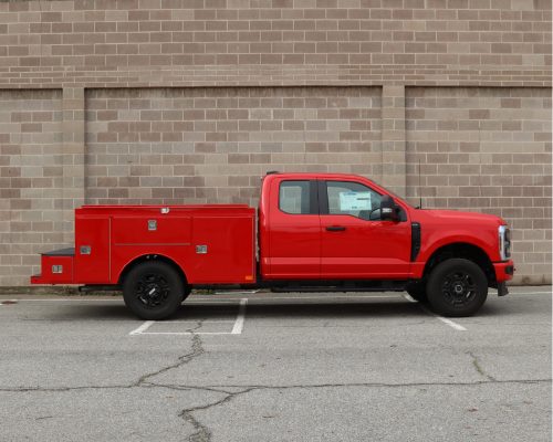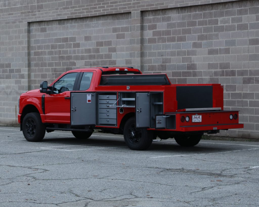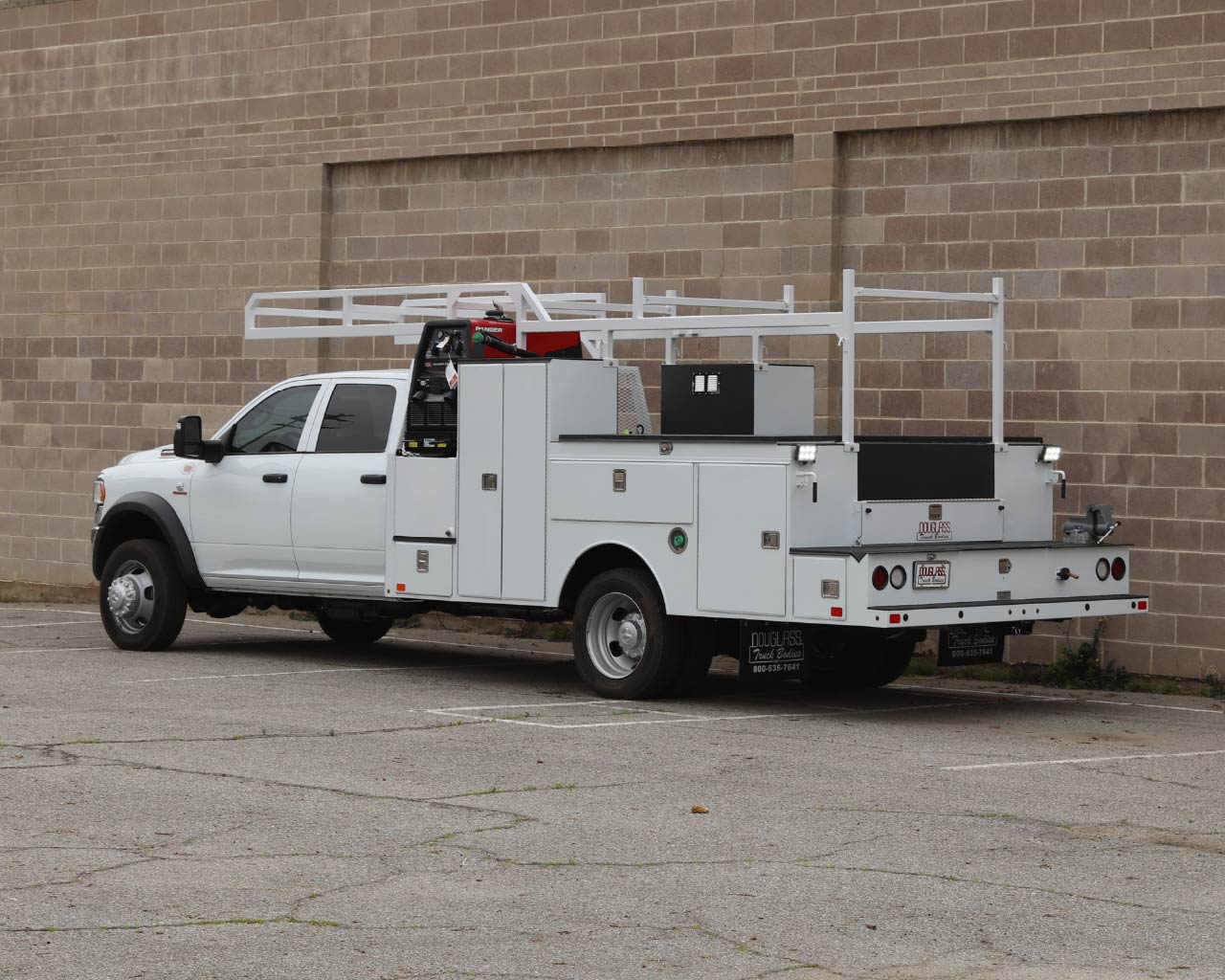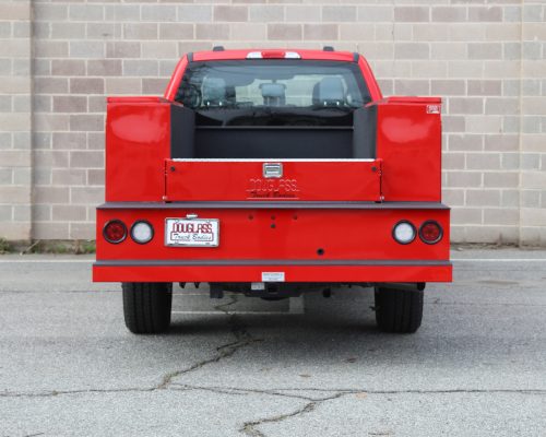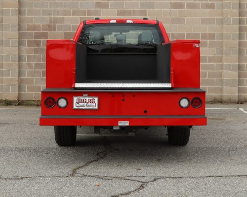 8′ Douglass Service Body with Flip Tops built for a 56″ cab-to-axle SRW Ford F350. Built with mechanics drawers, adjustable shelving, and a work platform with built-in compartments. Additionally, this received Arma coating in the cargo area, work platform, and on the bumper surface.