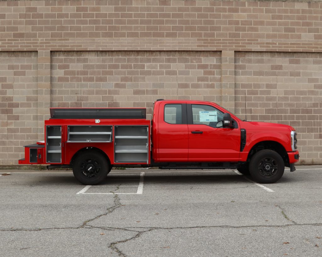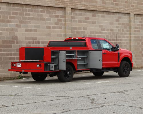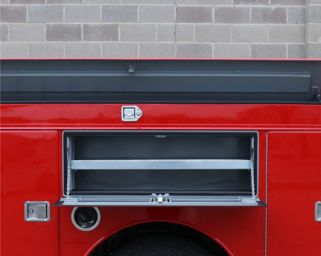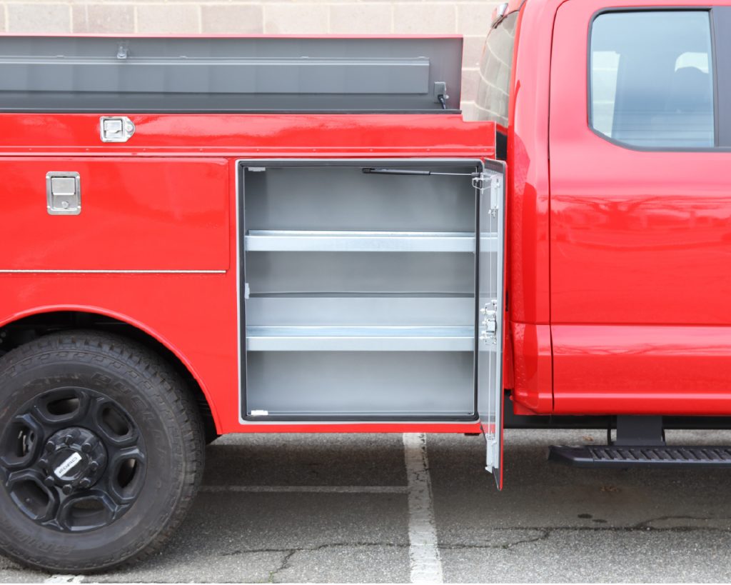 8′ Douglass Service Body with Flip Tops built for a 56″ cab-to-axle SRW Ford F350. Built with mechanics drawers, adjustable shelving, and a work platform with built-in compartments. Additionally, this received Arma coating in the cargo area, work platform, and on the bumper surface.