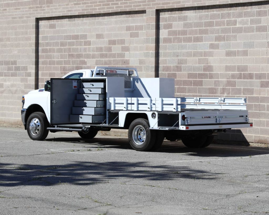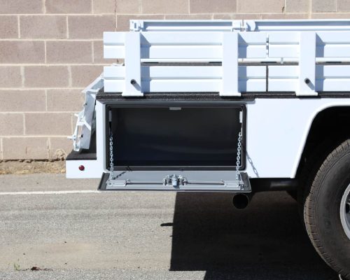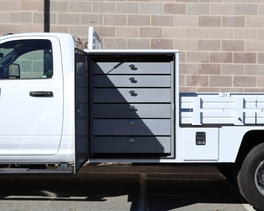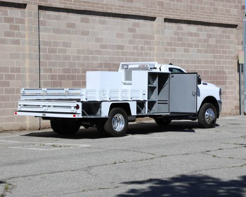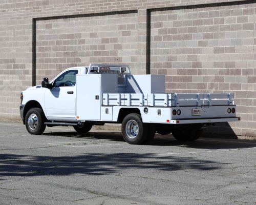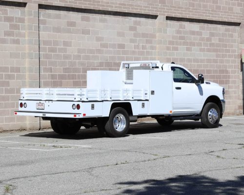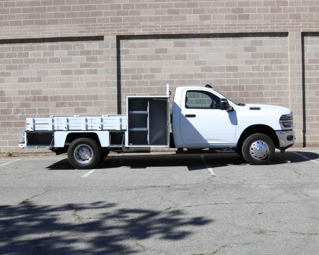 11′ Custom Douglass Cowboy Body built for an 84″ cab-to-axle DRW Dodge 3500. This build features raised front compartments with mechanics tool drawers on the driver’s side and a partitioned curbside compartment with adjustable shelving, along with additional floor-level compartments for easy access. Hinging side rails provide quick access to the cargo area, while heavy-duty tie-downs offer plenty of secure points for cargo control. A durable bedliner has been applied to the cargo floor and bumper for long-lasting protection. A cab protector with integrated work lights completes the build.