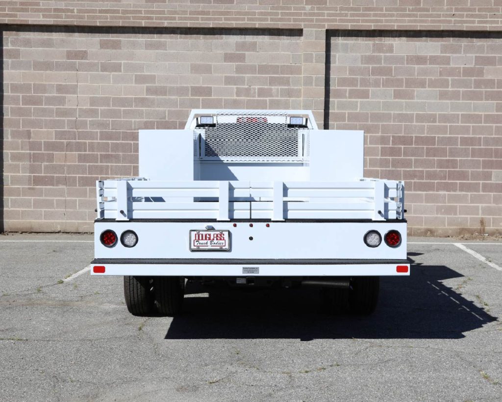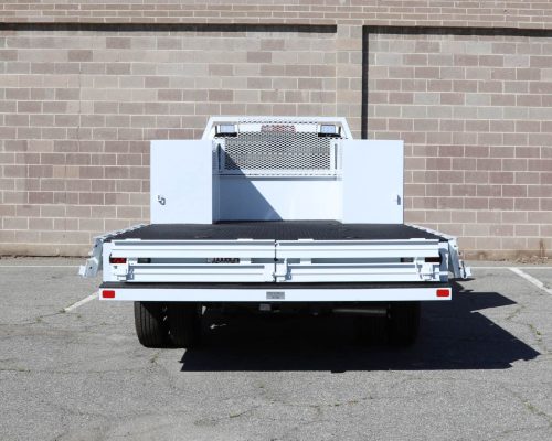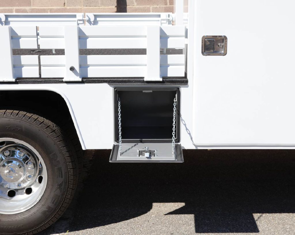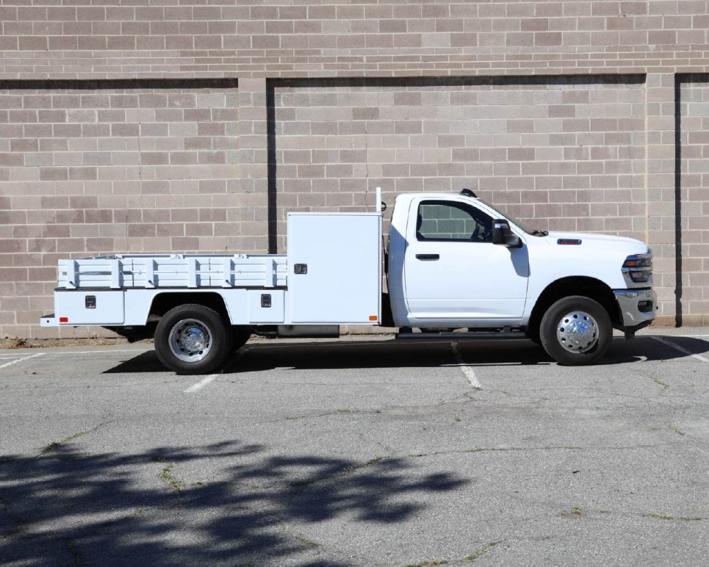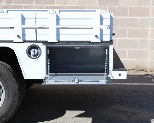 11′ Custom Douglass Cowboy Body built for an 84″ cab-to-axle DRW Dodge 3500. This build features raised front compartments with mechanics tool drawers on the driver’s side and a partitioned curbside compartment with adjustable shelving, along with additional floor-level compartments for easy access. Hinging side rails provide quick access to the cargo area, while heavy-duty tie-downs offer plenty of secure points for cargo control. A durable bedliner has been applied to the cargo floor and bumper for long-lasting protection. A cab protector with integrated work lights completes the build.